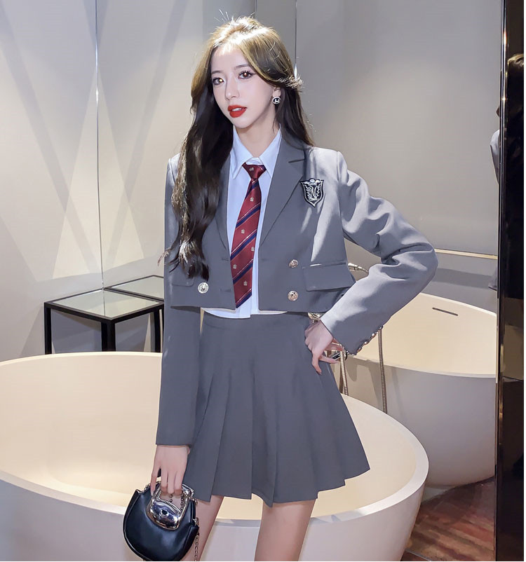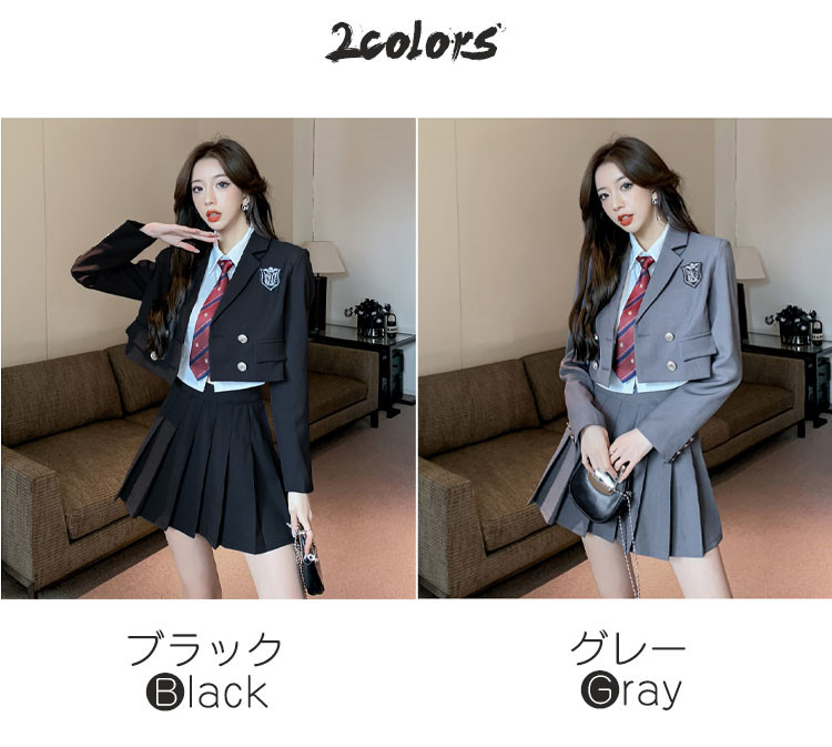 horizontal-key: 黒2点-「ブレザー+スカート」 灰2点-「ブレザー+スカート」 黒-4点セット 灰-4点セット