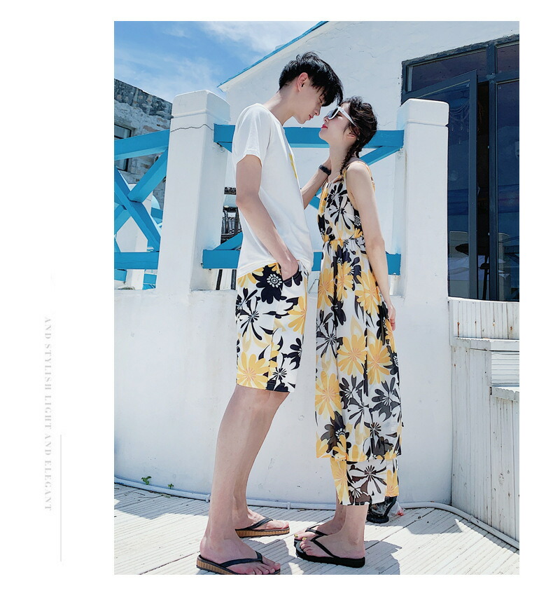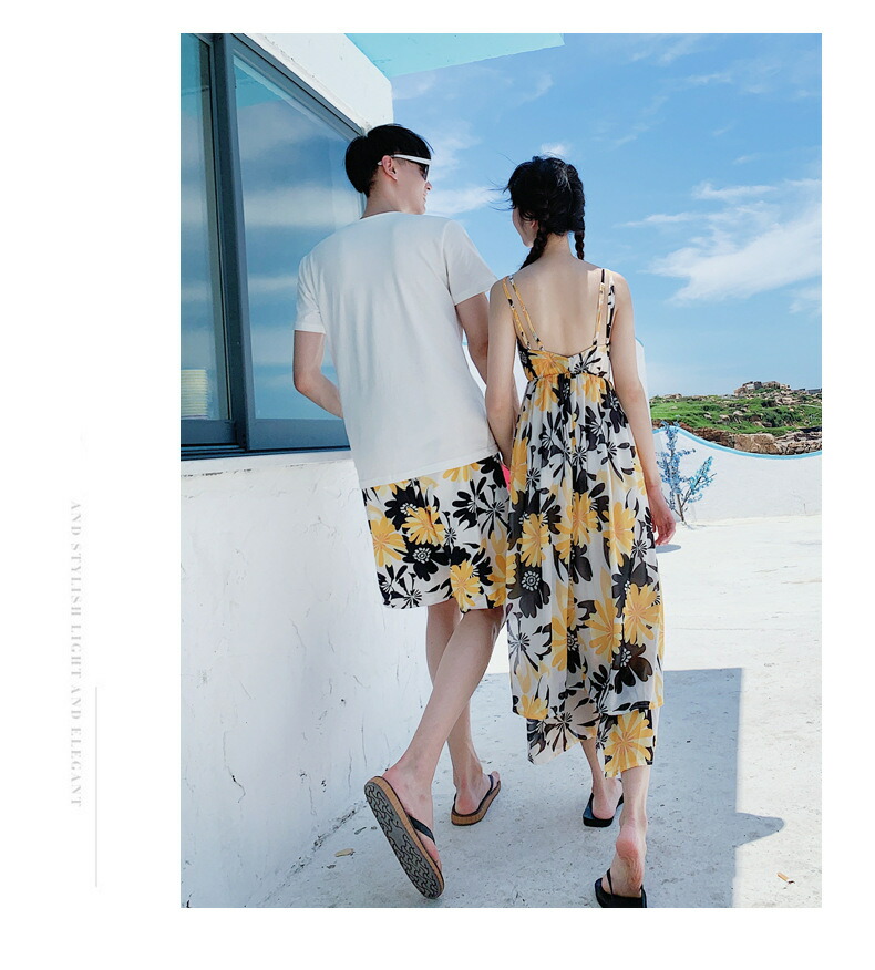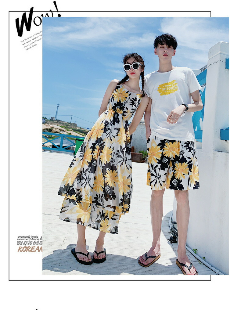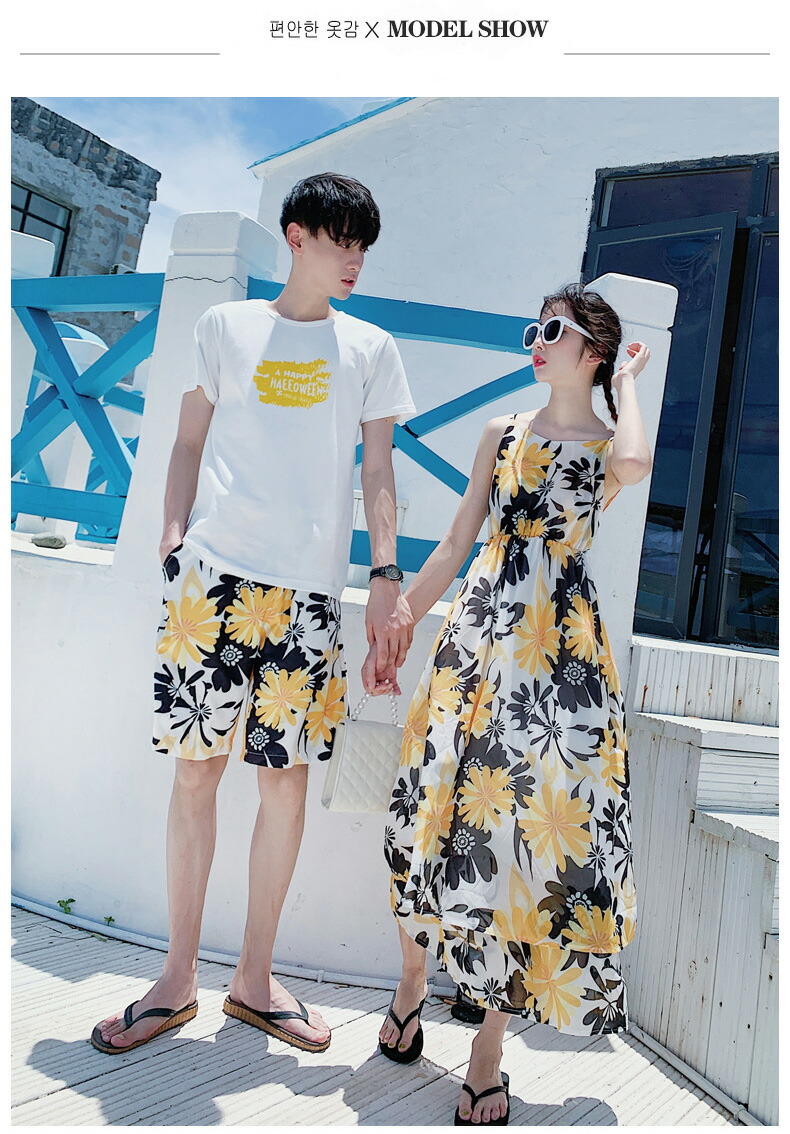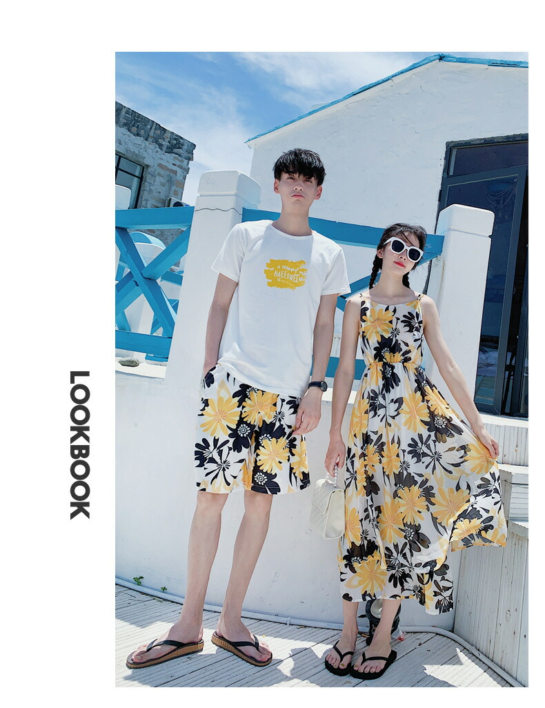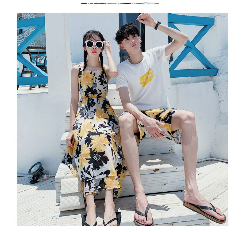 horizontal-key: 女性ワンピース 男性tシャツ+パンツ