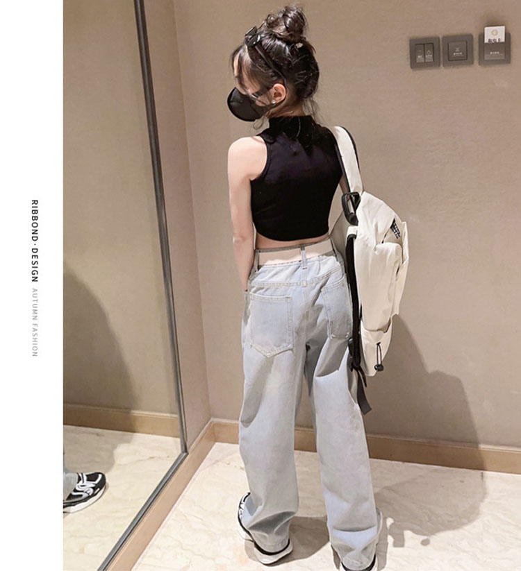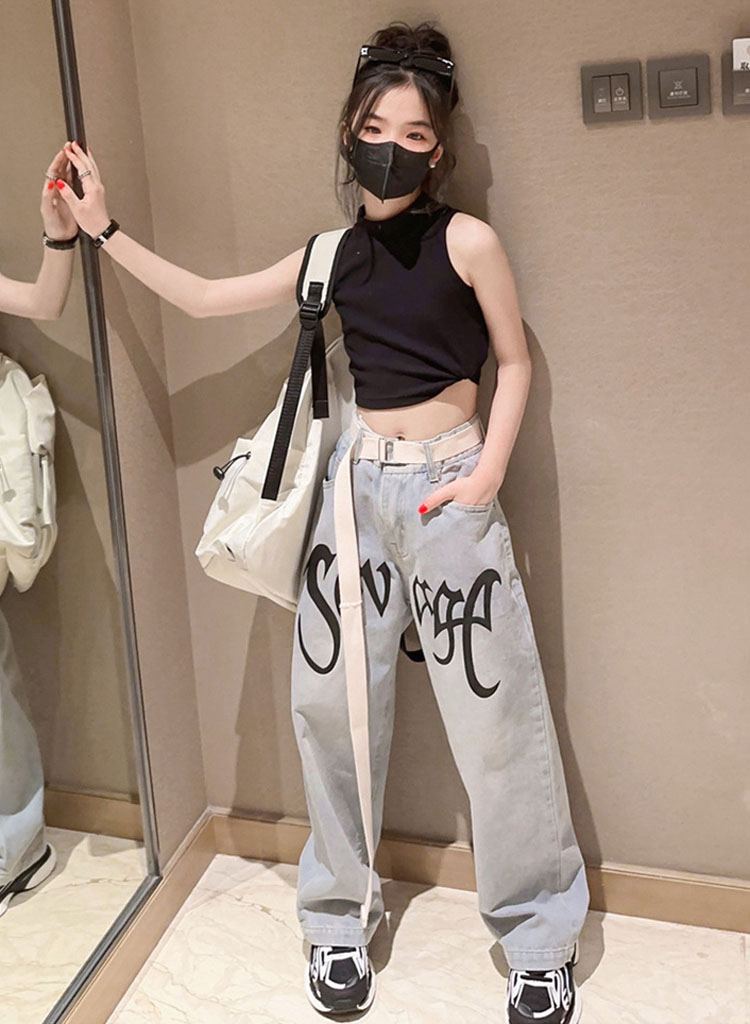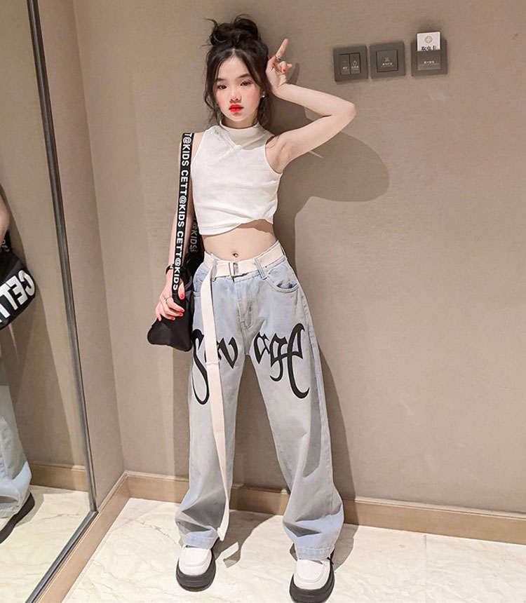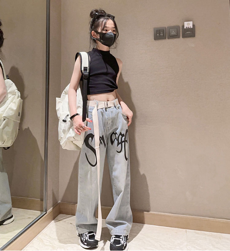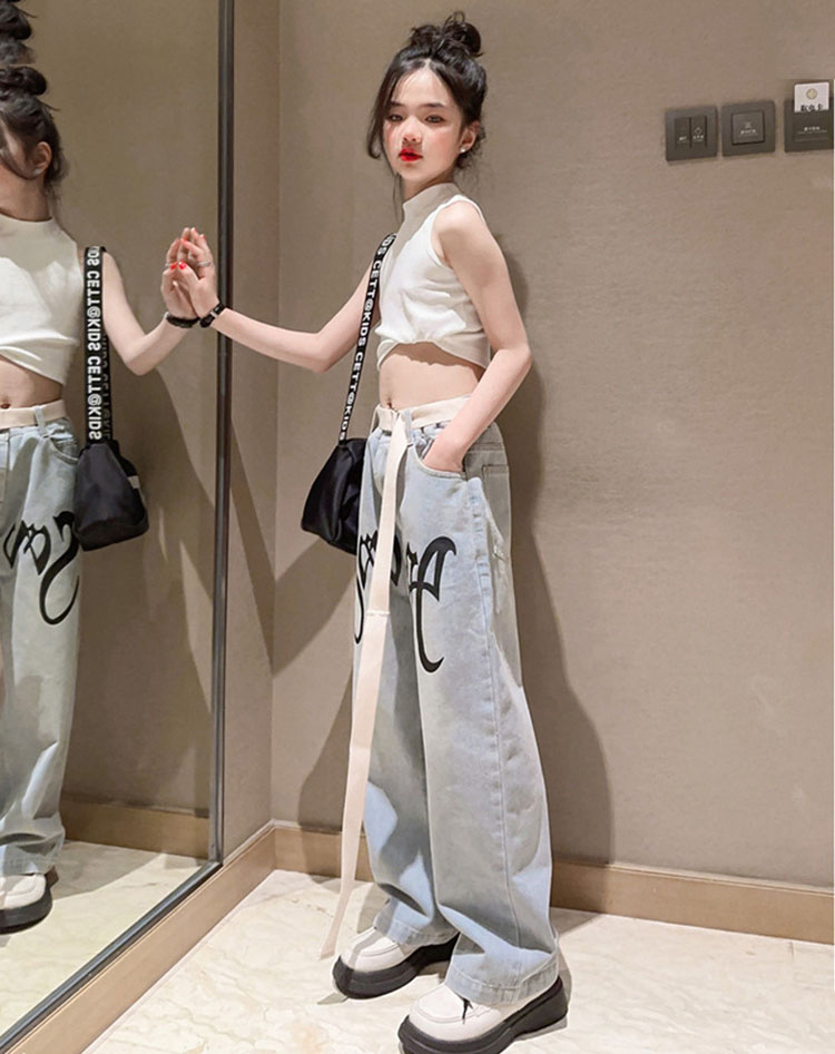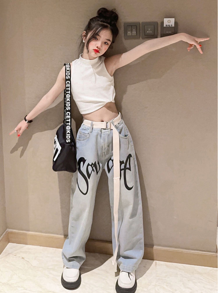 キッズ ダンス 衣装 セットアップ へそ出し トップス デニムパンツ ストレートパンツ k-pop HIPHOP ジャズダンス ヒップホップ 120 130 140 150 160 170
