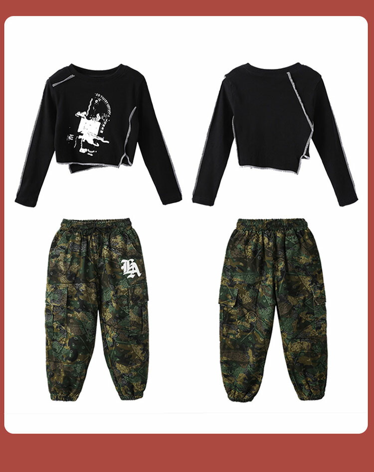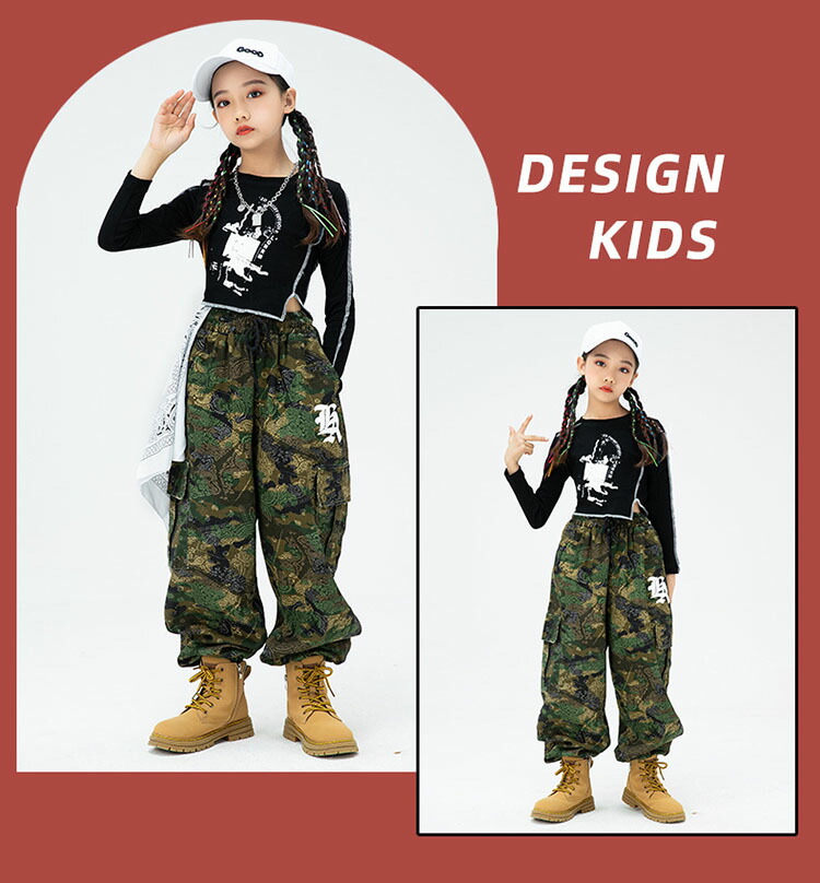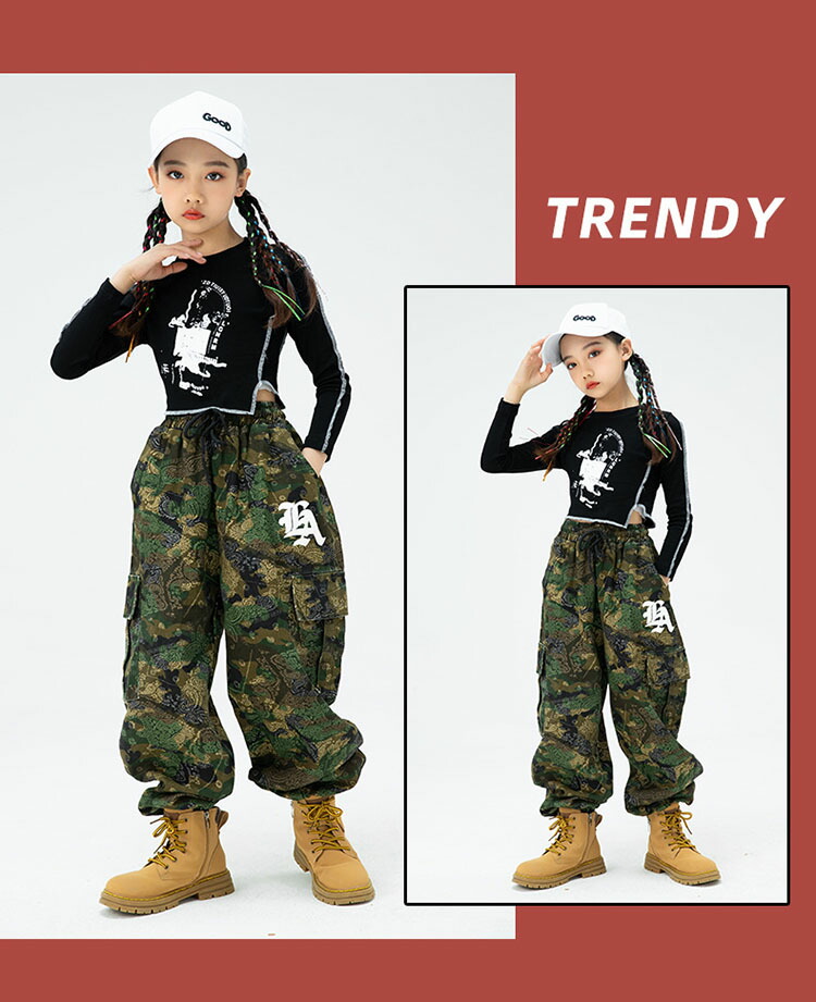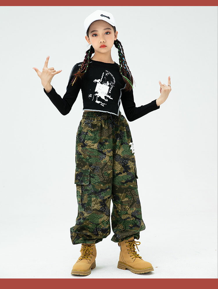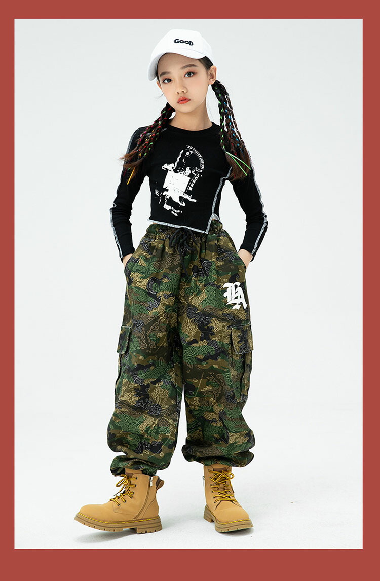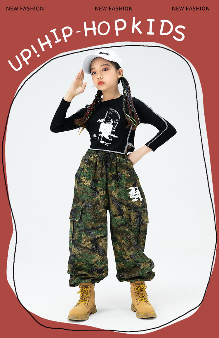 ダンス 衣装 ヒップホップ 迷彩 カーゴパンツ へそ出し トップス カッコイイ セットアップ 長ズボン HIPHOP 子供 女の子 ステージ衣装 団体服 発表会 演出服 韓国