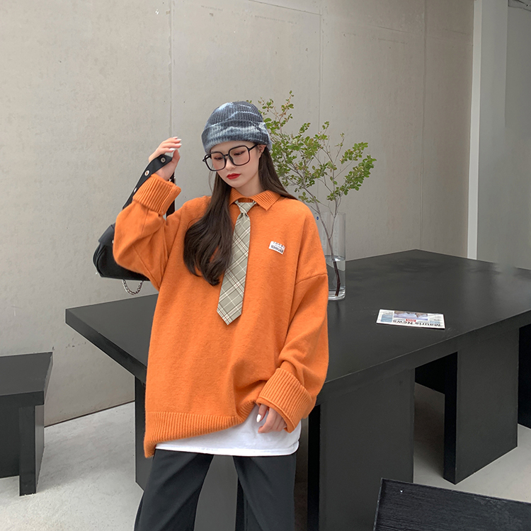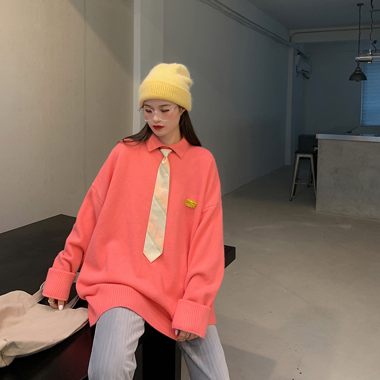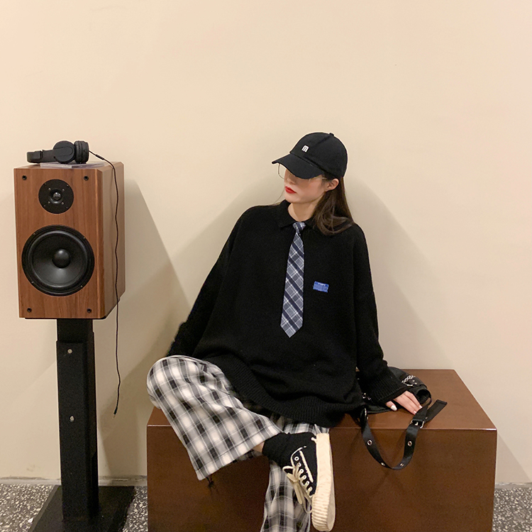 ネクタイ付セーター6色ニット長袖トップスちょうちょ蝶ロゴ刺繍レディースメンズガールづ大きいゆったり長めダンス衣装ヒップホップHIPHOP学生ポロシャツチェックおしゃれカラフルビッグ奇抜派手レトロ制服韓