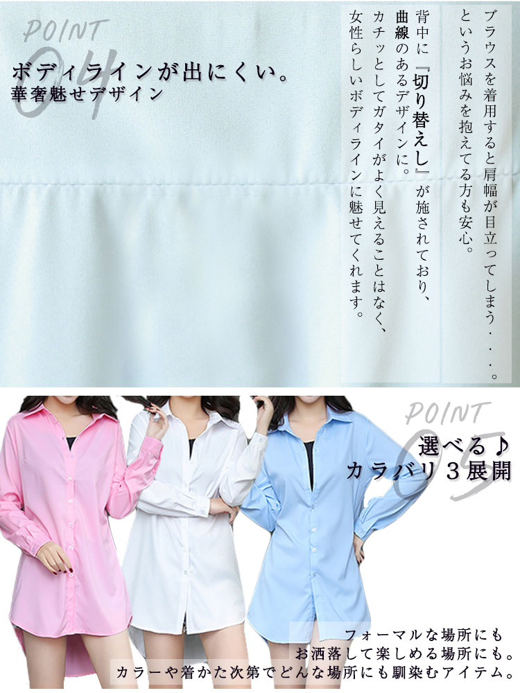 シャツ ブラウス レディース 長袖 大きめ 春 夏 秋 冬 ロング ワイシャツ チュニック シャツブラウス 襟付き 綿 大きいサイズ おしゃれ きれいめ ゆったり フォーマル オフィス カジュアル セレモニー 通勤 体型カバー 白 ホワイト ピンク ブルー