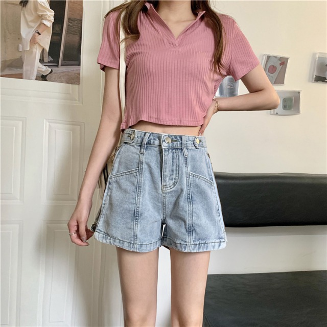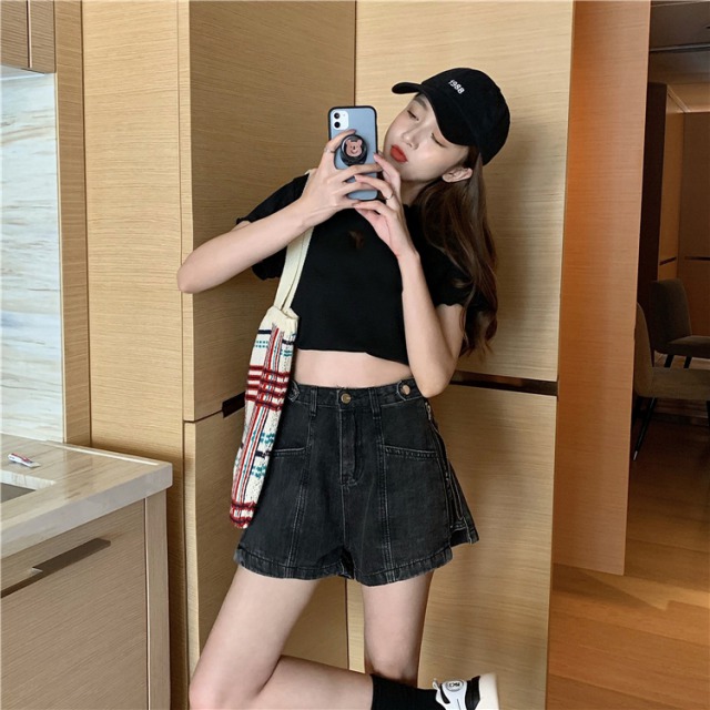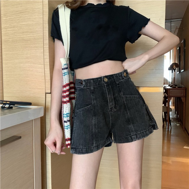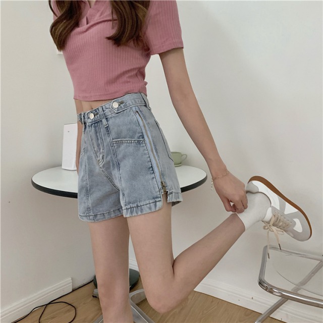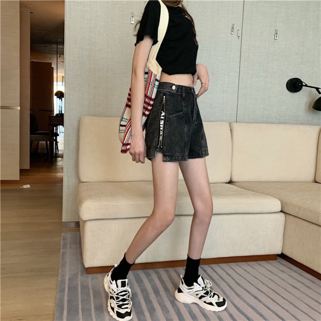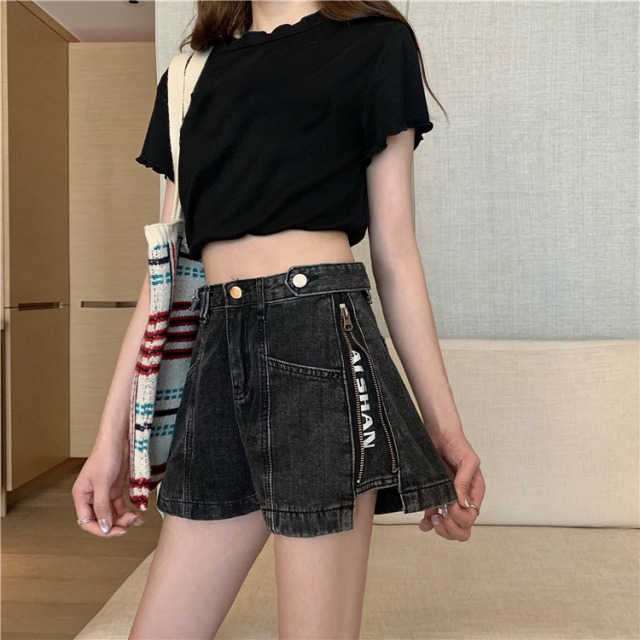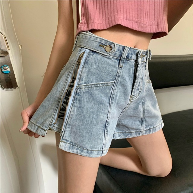 デニムパンツ2色ズボンボトムスショートパンツショーパンジップジッパーロゴ2wayレディースガールズ短いブルー青ブラック黒おしゃれかわいいかっこいいショーパンショートパンツ膝上ミニダンス衣装ヒップホップ