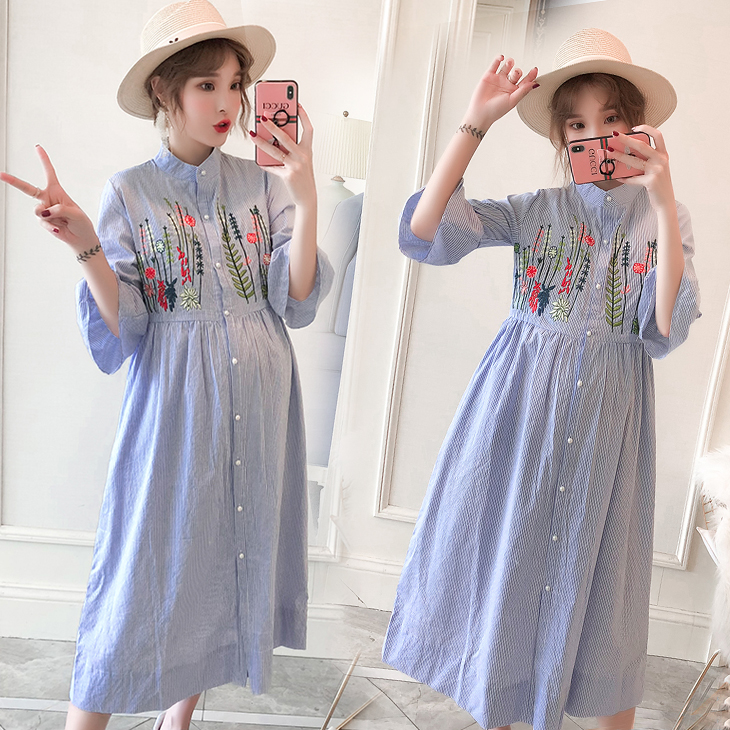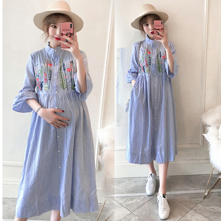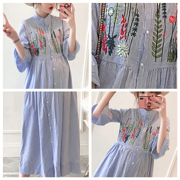 5サイズ M L XL 2XL 3XL 七分袖刺繍ストライプ マタニティシャツワンピース 妊婦 妊娠 妊婦コーデ コーディネート バンドカラー スタンドカラー 前開き ボタン ベルスリーブ 大きいサイ