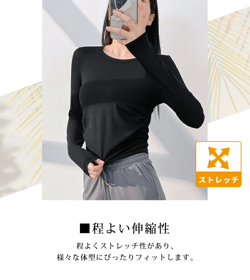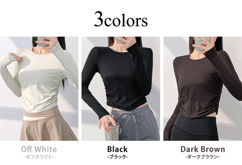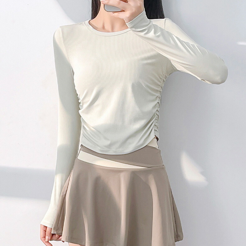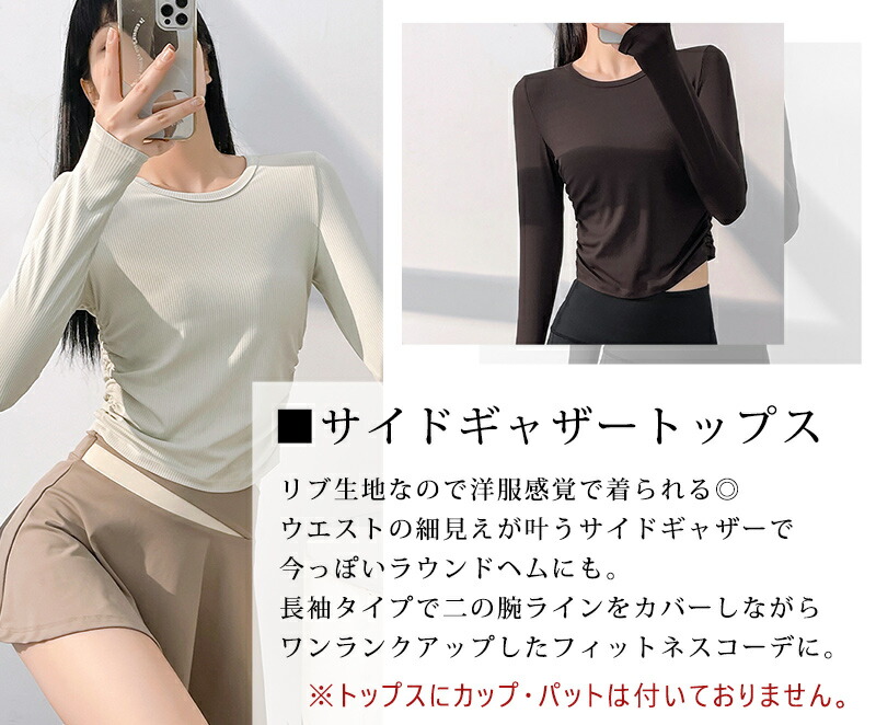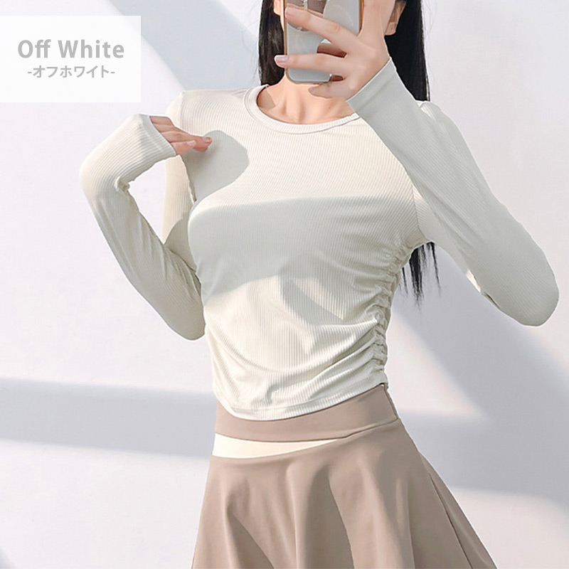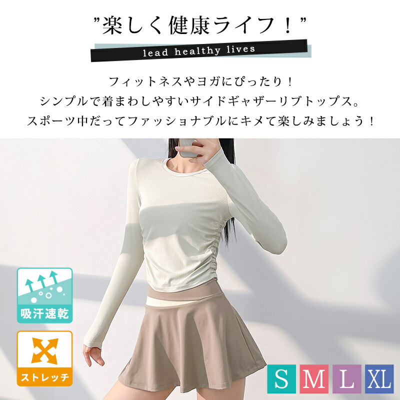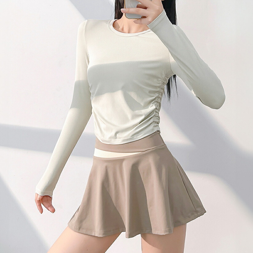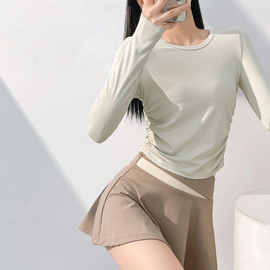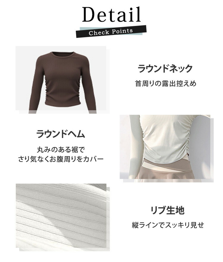 リブとサイドギャザーでウエストの細見せ