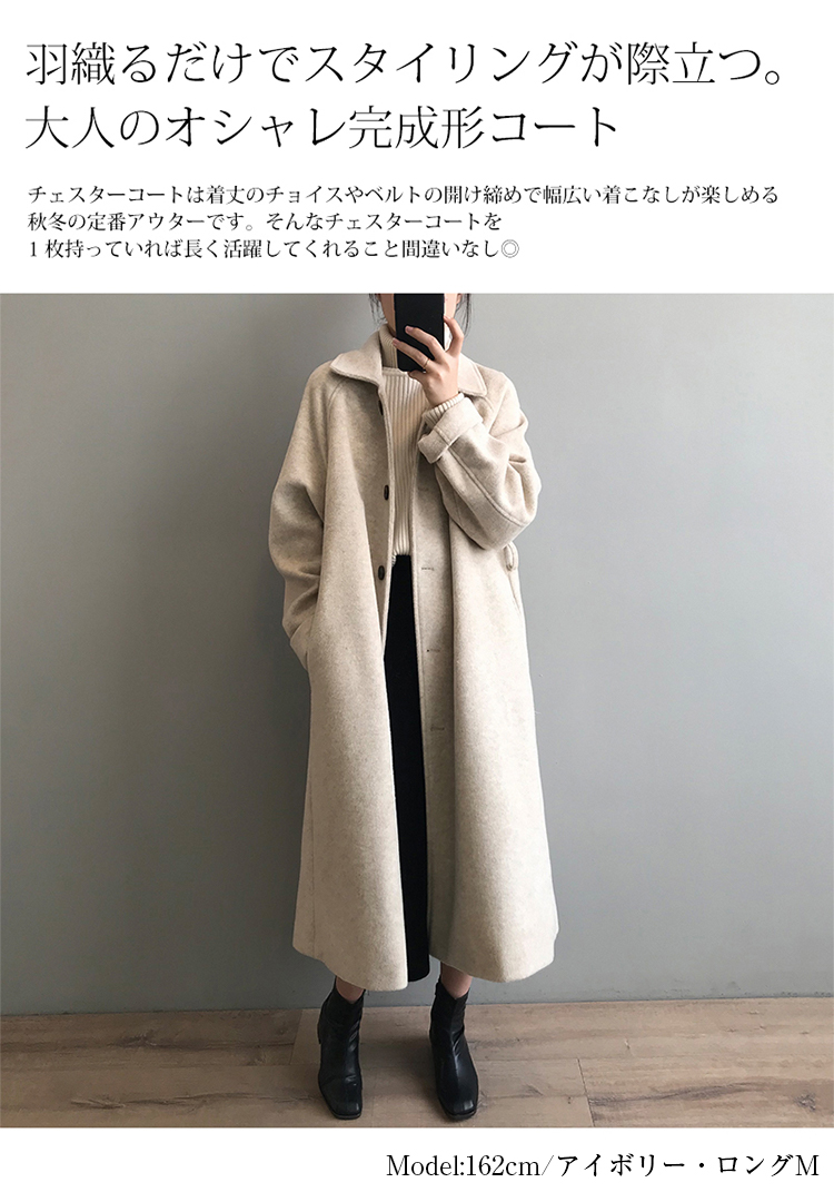とらみ■商品名チェスターコート コート レディース 秋 冬 ロングチェスターコート ロングコート 裏地付き アウター ジャケット 羽織 ロング丈 厚手 防寒 暖かい ベルト付き ポケット付き ゆったり 大きいサイズ お洒落 上品 シンプル カジュアル 無地 送料無料■サイズ袖丈 胸囲 裾 着丈M 69cm 110cm 170cm 109cmL 70cm 114cm 174cm 110cm多少の誤差が生じる場合がございます。予めご了承下さいませ■関連商品当店のコート・ジャケット 商品一覧 当店の個性溢れるアイテム特集■洗濯表示■素材ポリエステル85% 綿15%なし■カラー■ベージュ、アイボリー■重さ■約1495g■伸縮性■なし■裏地■あり■ポケット■あり画面上と実物では多少色具合が異なって見える場合もございます。ご了承ください。■商品説明秋冬のコーデ完成度を格上げすること間違いなし。ひらりと揺れるロングテーラードが登場!!