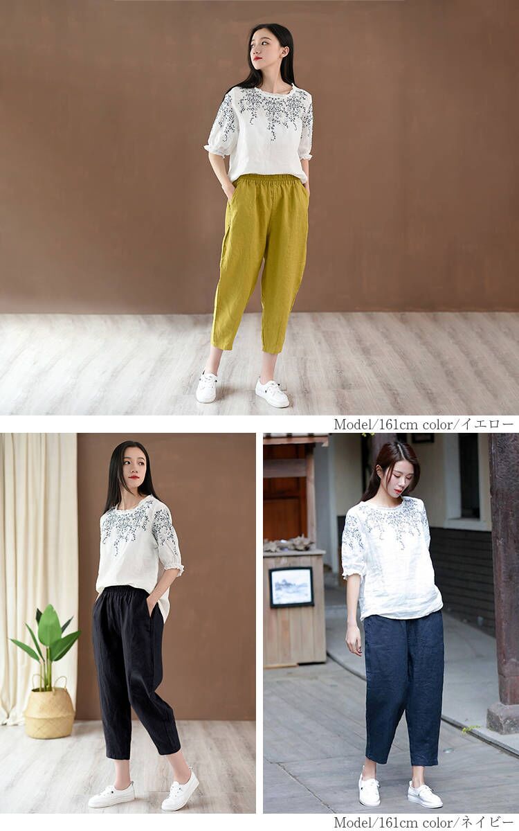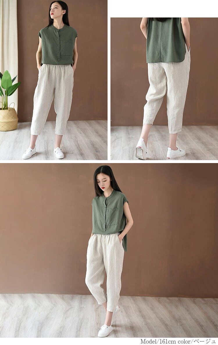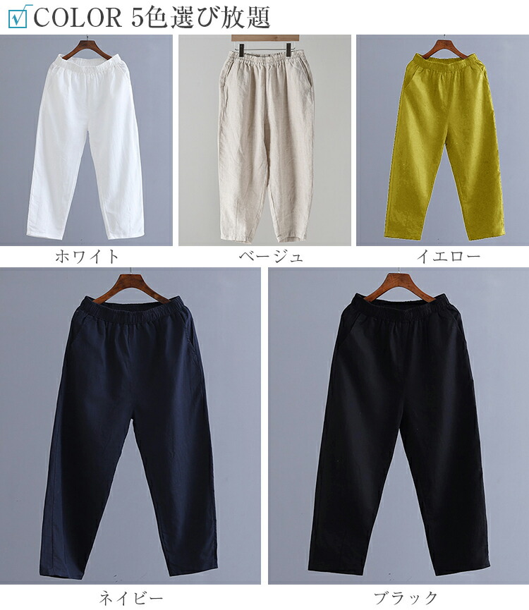 とらみ■商品名リネンテーパード パンツ レディース 春 夏 9分丈 リネン パンツ 麻 亜麻 麻混 タック ロング テーパード リラックスパンツ ウエストゴム 自宅 ボトムス 快適 涼しい ゆったり 大きいサイズ きれいめ ボトムス 美脚 カジュアル 無地 送料無料■サイズ着丈 ヒップ ウエスト もも幅 裾幅 股下 おすすめ体重S 80cm 102cm 62/94cm 62cm 30cm 50cm 44.5kg-55kgM 82cm 106cm 65/98cm 64cm 32cm 52cm 50kg-65kgL 84cm 110cm 68/102cm 68cm 34cm 54cm 65kg-75kg多少の誤差が生じる場合がございます。予めご了承下さいませ■素材リネン70% 綿30%タンブラー乾燥はお避け下さい。■カラー■ネイビー 、ベージュ 、ホワイト、 ブラック、 イエロー画面上と実物では多少色具合が異なって見える場合もございます。ご了承ください。■商品説明『女の子もカッコ可愛くありたい。』