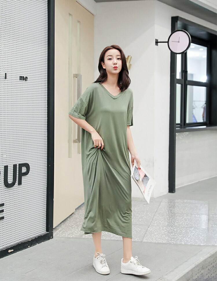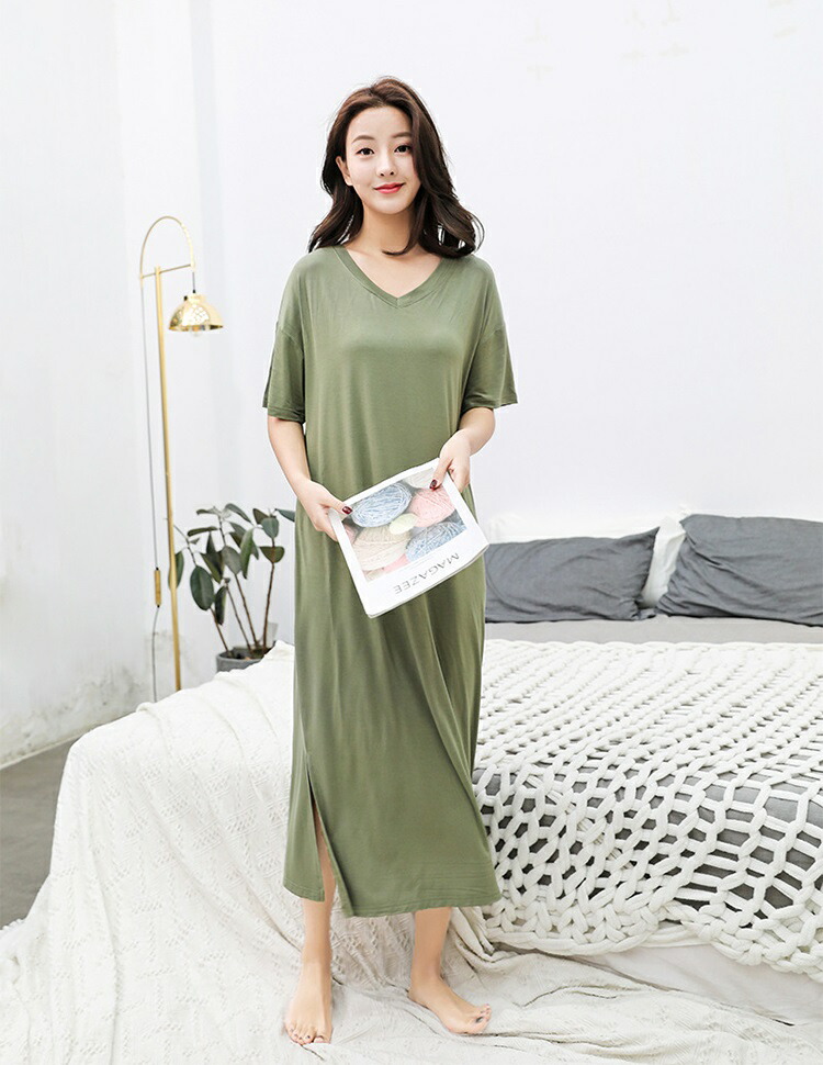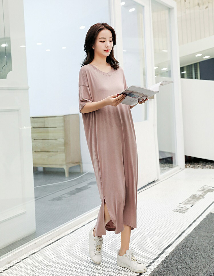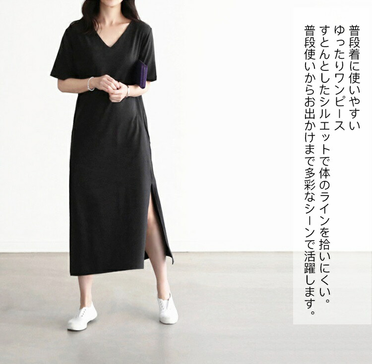 tシャツ ワンピース レディース 夏 半袖 Vネック tシャツワンピース ルームウェア ワンピース ロングワンピース スリット 柔らか 綺麗 通気性 吸湿速乾 部屋着 シンプル 敬老の日 プレゼント
