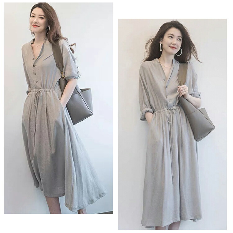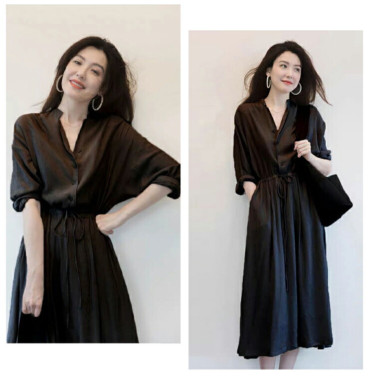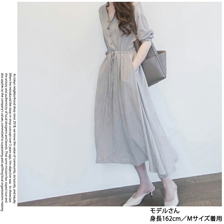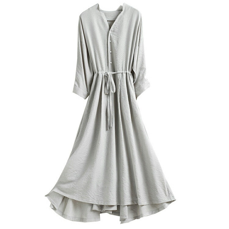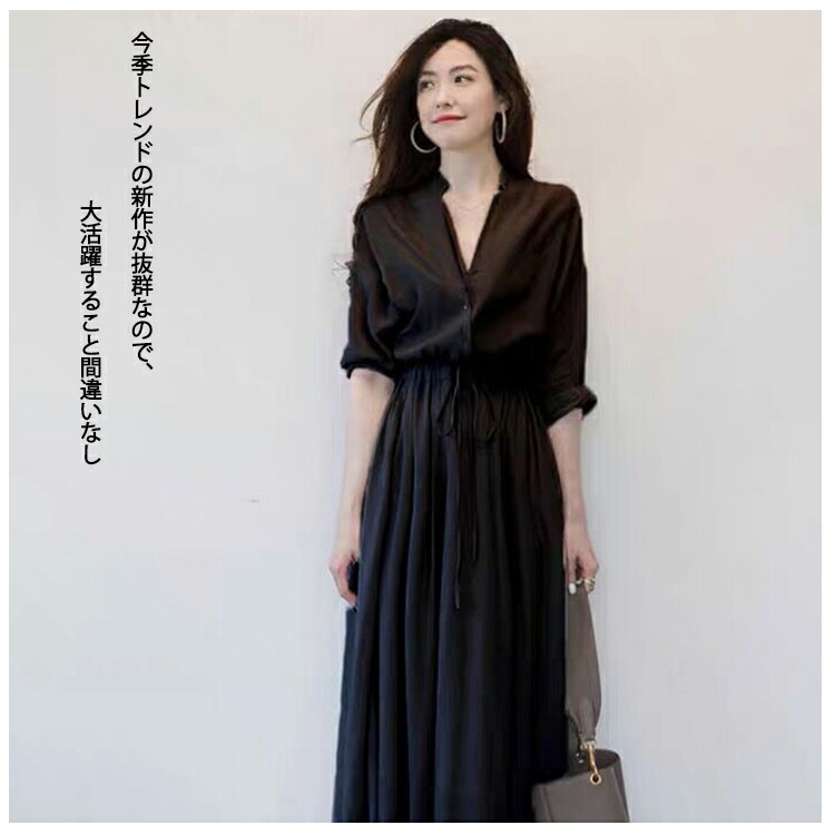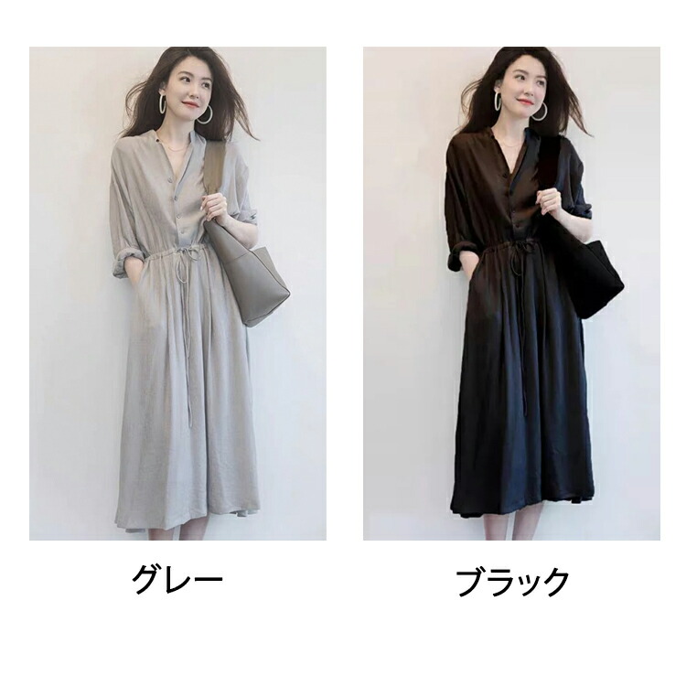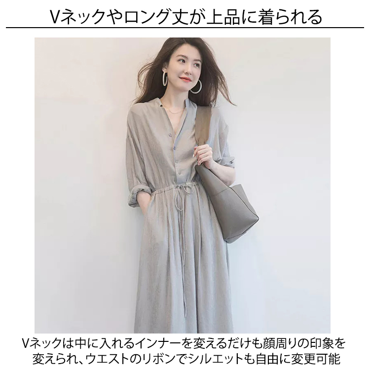 Vネック ロングワンピース シャツワンピース レディース 春 夏 秋 ミモレ丈 ロング丈 ワンピース 無地 リボン付き Aライン 綺麗 大きいサイズ 通勤 入園式卒業式 敬老の日 プレゼント