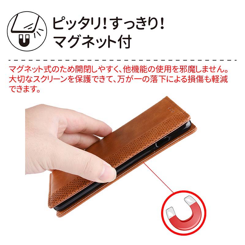 ※ケースの蓋の開閉部分に磁石が使用されている場合、ICカードポケットやケースの近くに磁気カード(クレジットカードやキャッシュカードなど)を入れたり近づけたりすることはお控えください。磁石の影響による磁気カードの破損等に関しましては一切保証いたしかねます。あらかじめご了承ください。