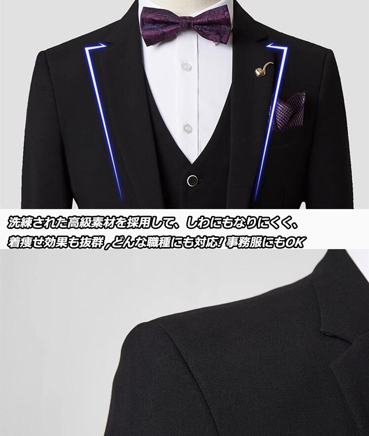 メンズビジネススーツ、スリーピース 上下セット、小さいサイズから大きいサイズまで、スリムフィットで快適に着用いただけます