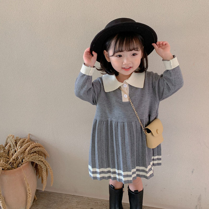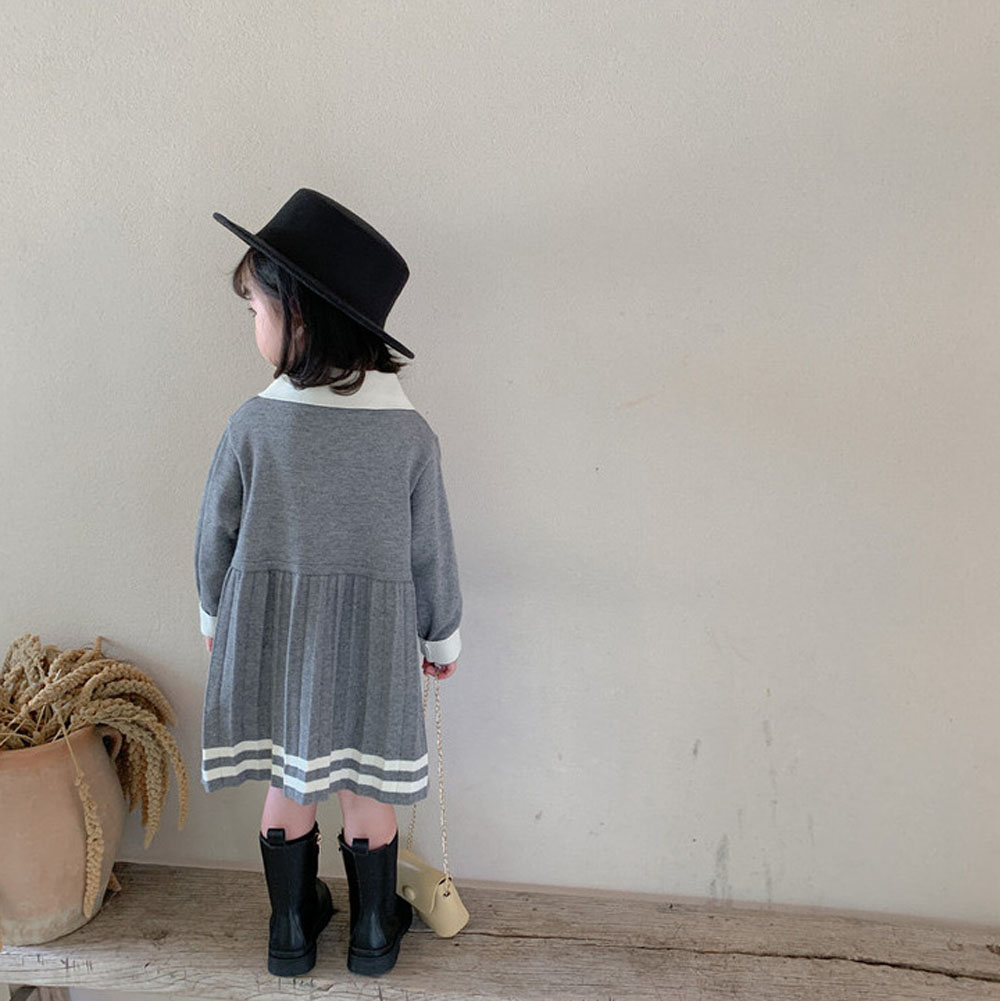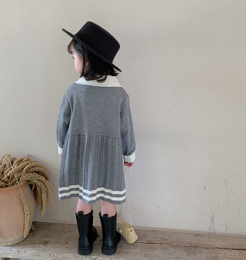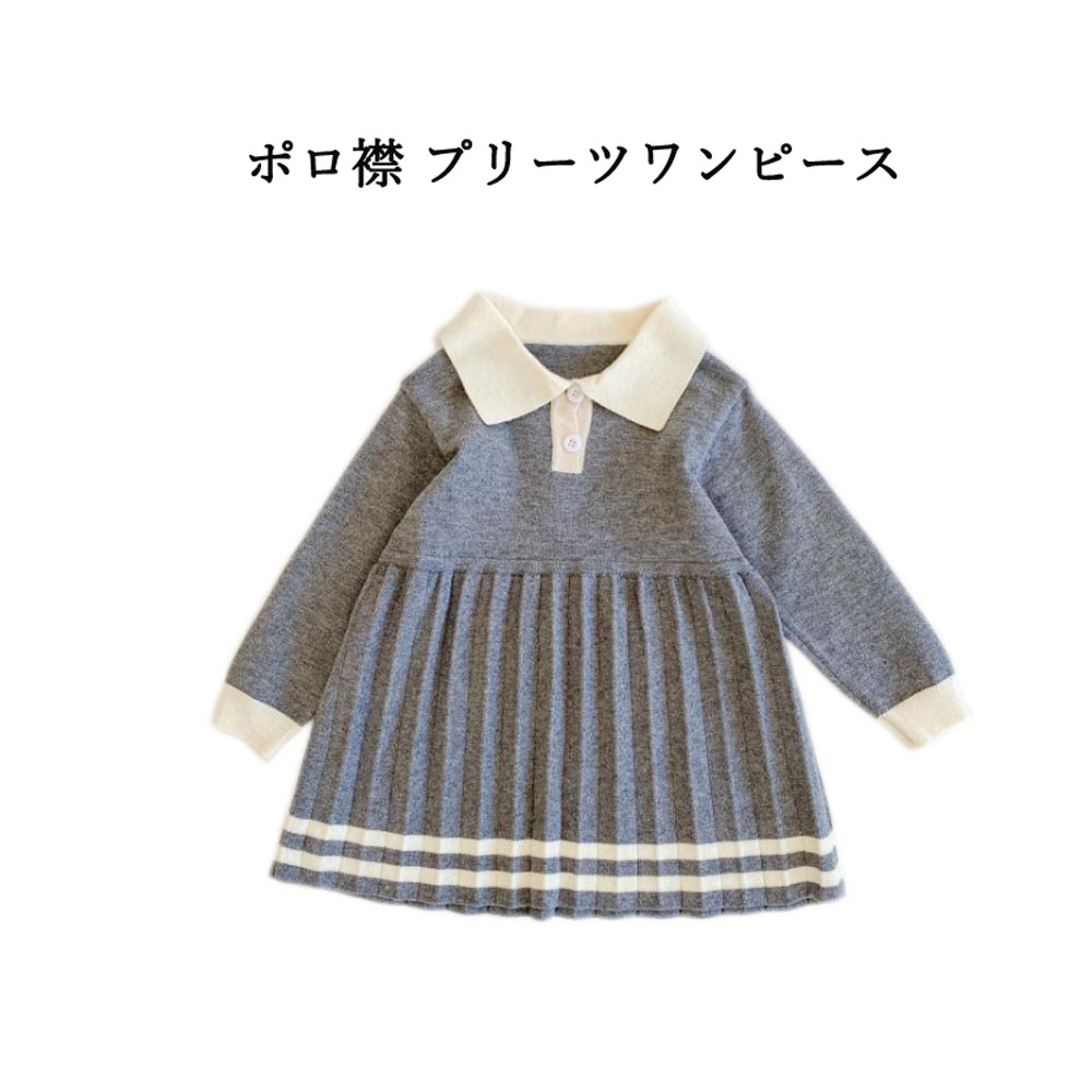 即納 入園式 女の子 ワンピース きれいめ 春秋冬 入学式 ベビードレス プリーツワンピース ニットワンピース ポロ襟 長袖 ライン入りワンピース 上品 きちんと感 子供服 キッズ 子ども 祝い 赤ちゃん 誕生日 服 1歳 2歳 3歳 4歳 90-110 グレー 送料無料