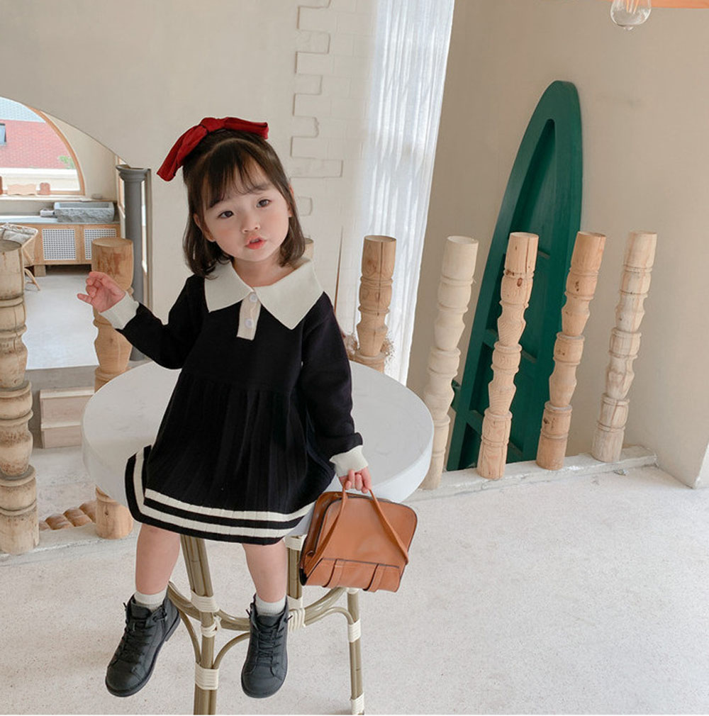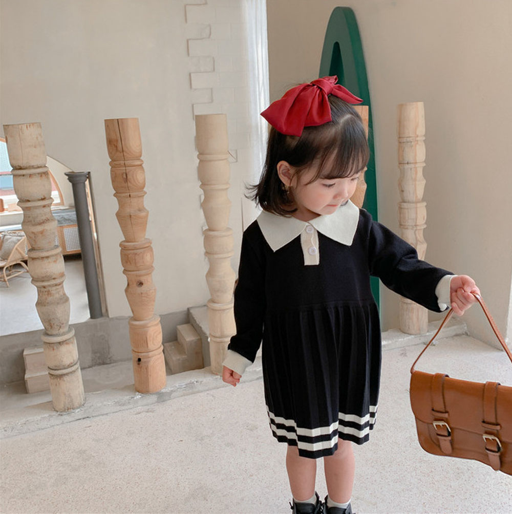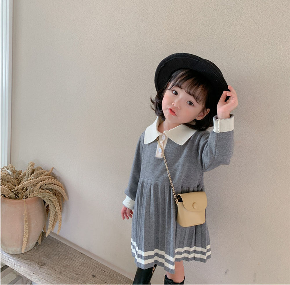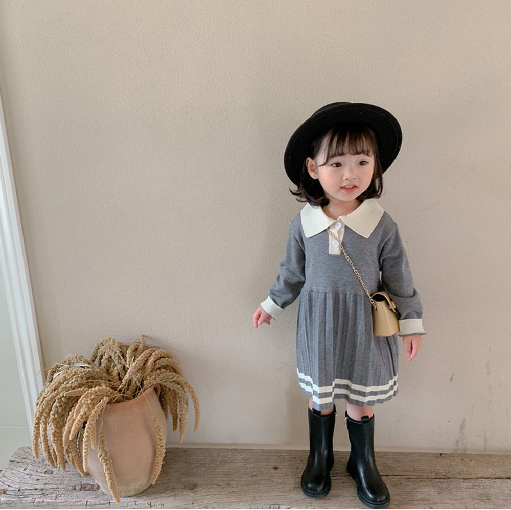 即納 入園式 女の子 ワンピース きれいめ 春秋冬 入学式 ベビードレス プリーツワンピース ニットワンピース ポロ襟 長袖 ライン入りワンピース 上品 きちんと感 子供服 キッズ 子ども 祝い 赤ちゃん 誕生日 服 1歳 2歳 3歳 4歳 90-110 グレー 送料無料