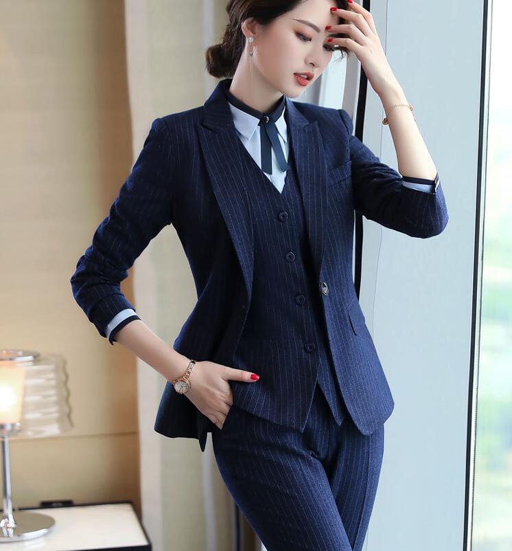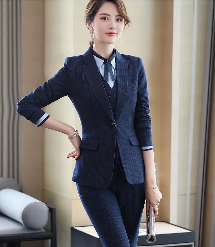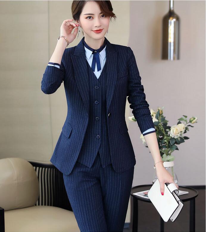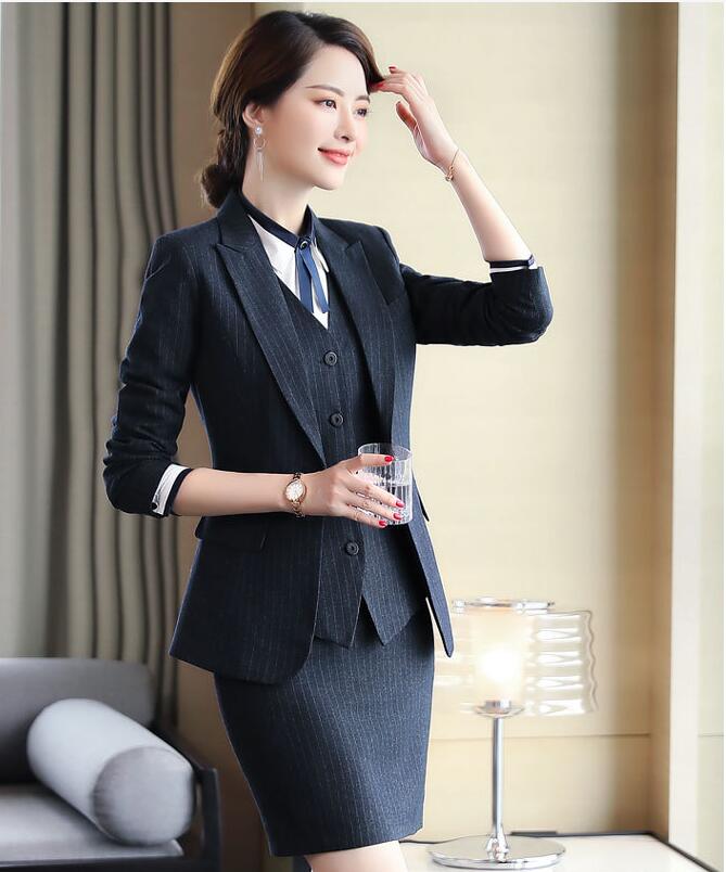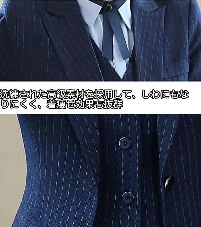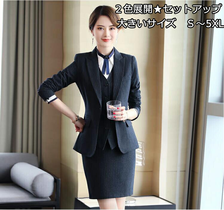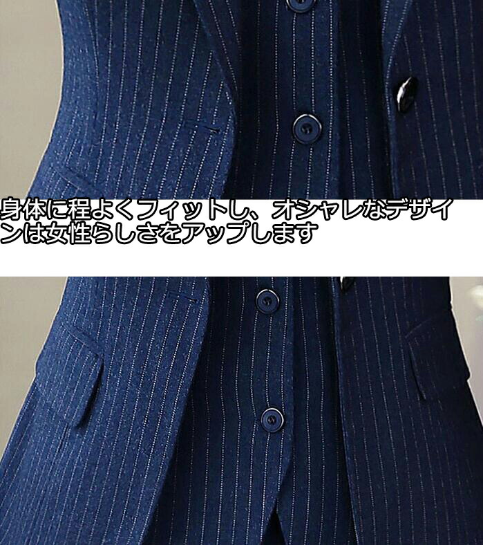 上品 黒 青 セットアップ 2色 ストライプ 縞々柄 4点セット レディース ジャケット+シャツ+ベスト+パンツ スカート レディーススーツ 4ピーススーツ S~4XL 1つボタン スリムスーツ