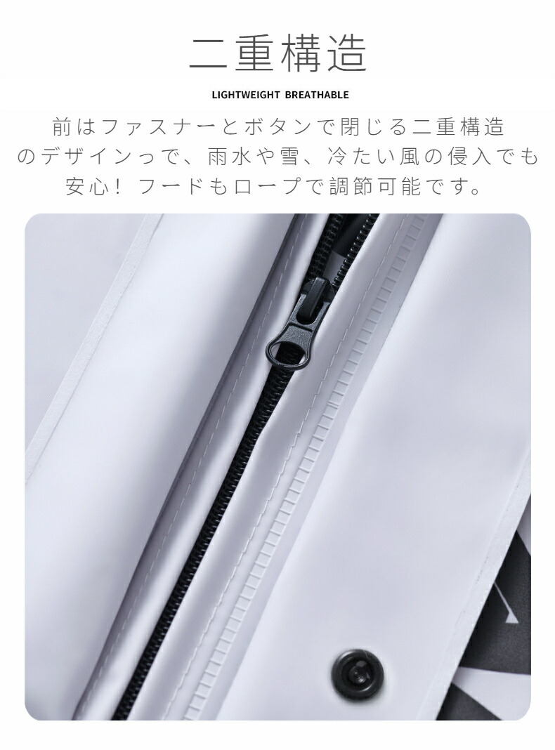 前はファスナーとボタンで閉じる二重構造のデザインっで、風や雨の浸入を防ぎます。