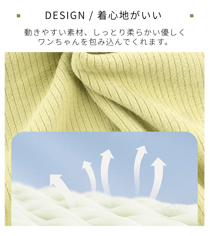 伸縮性があり動きやすい素材、しっとり柔らかい優しくワンちゃんを包み込んでくれます。
