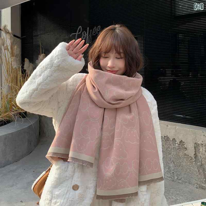 レディース ファッション 秋冬 ニット スカーフ マフラー 女性 韓国 ネックウォーマー かわいい おしゃれ 65cm×200cm 両面 ショール クマ 厚手 ショール シンプル