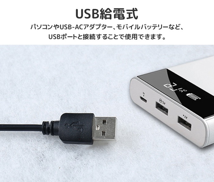 ● USB給電式なので、パソコンやUSB-ACアダプター、モバイルバッテリーなど、USBポートと接続することで使用できます。