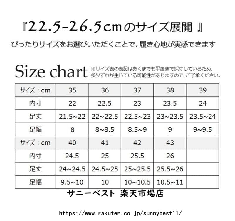 サイズ: 35(22.5cm) 36(23.0cm) 37(23.5cm) 38(24.0cm) 39(24.5cm) 40(25.0cm) 41(25.5cm) 42(26.0cm) 43(26.5cm)