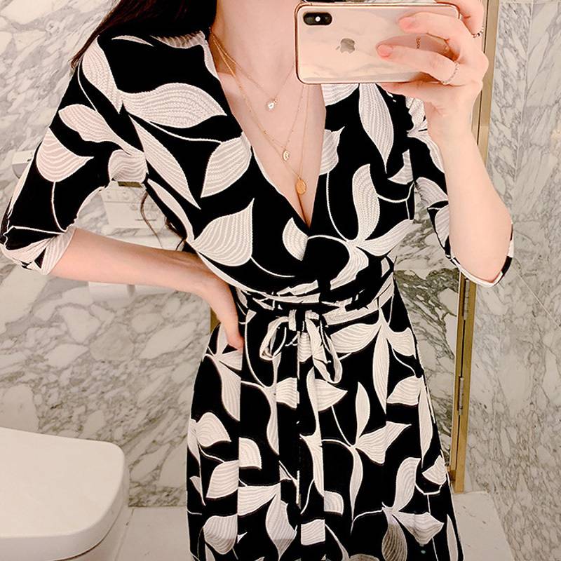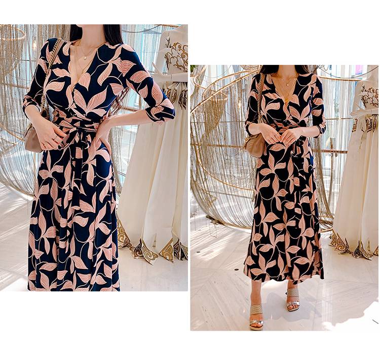 ロング ワンピース 七分袖 レディース 春 秋 ボタニカル Vネック Aライン フレア ウエストリボン ハイウエスト イベント 休日 お出かけ デート コーデ 普段使い 女子