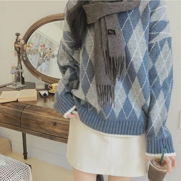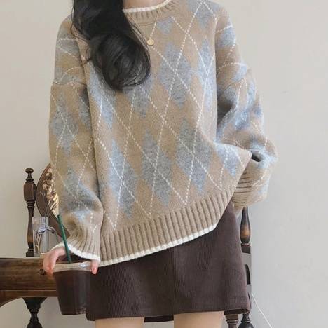 トップス レディース ニット セーター 長袖 ラウンドネック アーガイル 柄 きれいめ シンプル カジュアル 大人 上品 おしゃれ かっこいい レトロ 抜け感 デート コーデ