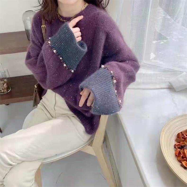 ラメ感で大人可愛い魅力を引き立てるニット。バイカラーデザインが、都会的で上品な雰囲気を演出します。オーバーサイズのシルエットは、きれいめからガーリーまで、あなたの個性を引き立てます。トレンド感と着回しの自由さを兼ね備えた、モテ度抜群のアイテムです。紫とグレーのパールがキラキラ輝き、インスタ映えも叶えます。自信を持ってロマンティックなスタイルを楽しんでください。