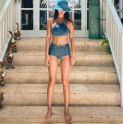 クールでおしゃれなモード系スタイリッシュなデニム無地が、夏の海やプールで背中見せスタイルをトレンド感溢れるインスタ映えに。