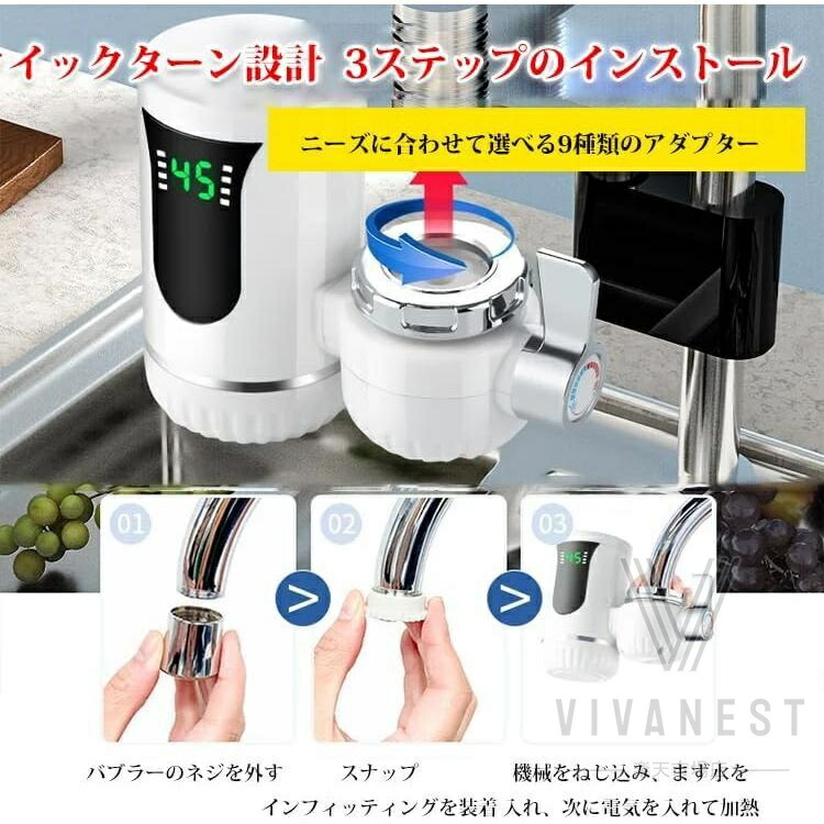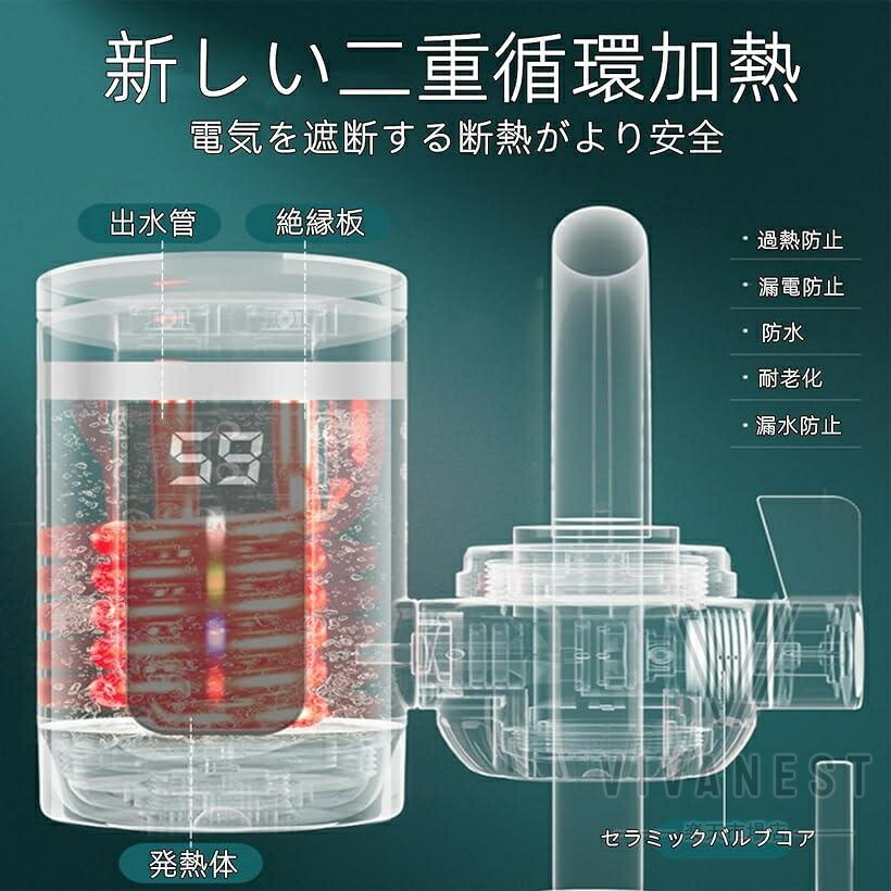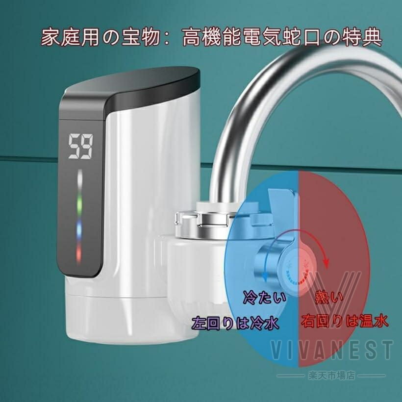 また、節水とエネルギー効率の良さもこの製品の大きな魅力の一つです。忙しい朝や、すばやく温水を使いたい時にも、この電気温水蛇口はあなたの時間を節約し、水道料金の節約にも貢献します。毎日の生活をより快適に、そして効率的に支えるための理想的な選択肢です。素材 304ステンレス鋼加熱管、高速加熱、より耐久性機能 速いお湯の量に制限はなく、水と電気を節約できます。蛇口をオンにするとお湯が出ます。手や皿、野菜を洗うことができます。冬はお湯を待つ必要はありません。簡単なインストール 古い蛇口を分解する必要はなく、工具も不要で、すばやく直接インストールできます。温度表示 高感度温度センサー、水温のリアルタイム表示、使いやすい。