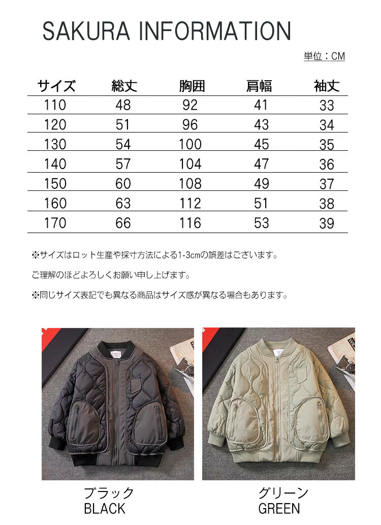 商品情報素材 表地:ポリエステル100% 裏地:ポリエステル100% 詰物:ポリエステル100%裏地 あり生地の伸縮性 なし生地の透け感 なしカラー 黒(black)、グリーン(green)サイズ 100cm/110cm/120cm/130cm/140cm/150cm/160cm/170cmサイズ表にご参考まで生産国 中国包装について 環境保護の観点から、「簡易包装」を推進しております明細書について 当店ではエコロジーと個人情報流出防止のため、ご指示の無い限り明細書を発行しておりません。