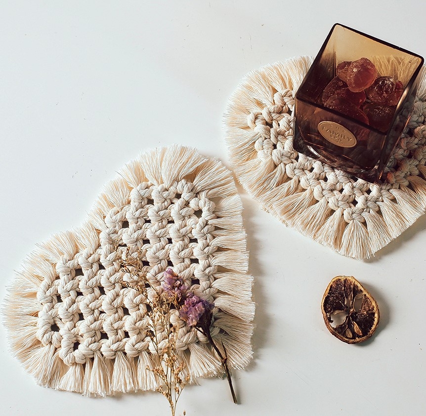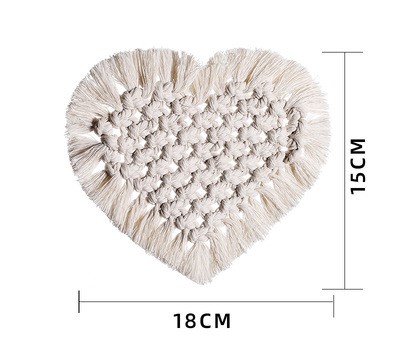 マクラメハートコースター置物おしゃれ白韓国雑貨インテリアアンティーク北欧キャンドルアクセサリータペストリー編み込みモダンコットンロープテーブルボヘミアンマット敷物ディスプレイ小物置きホワイトアイボリー