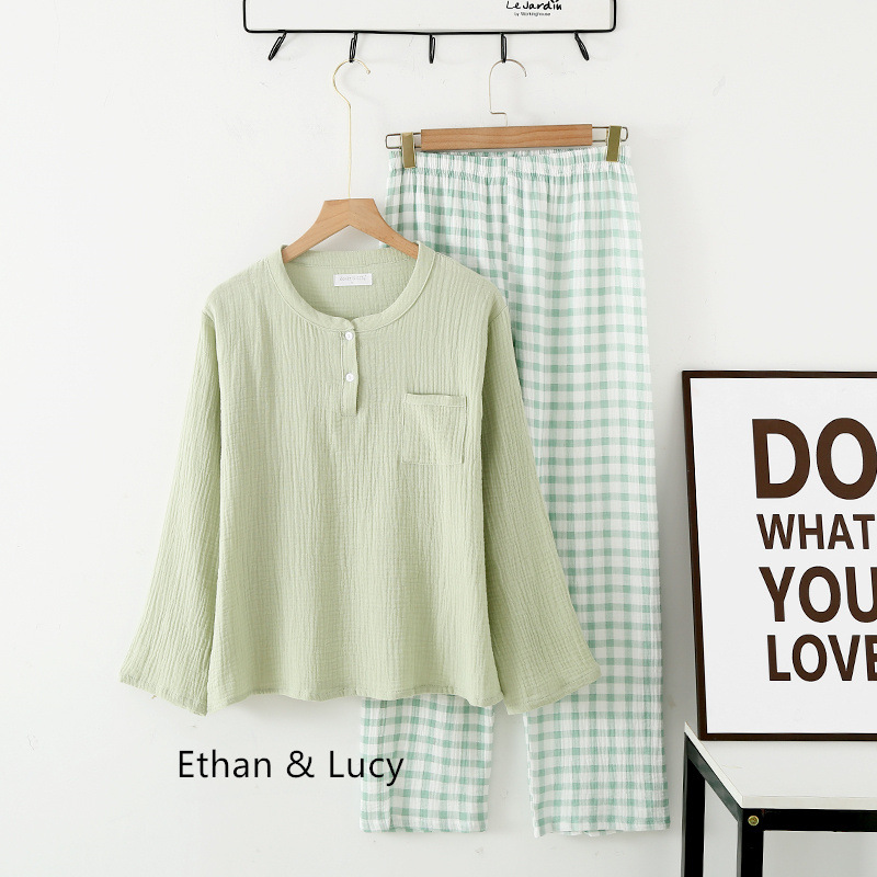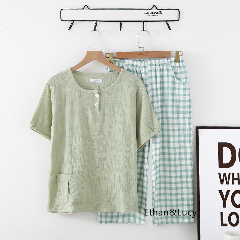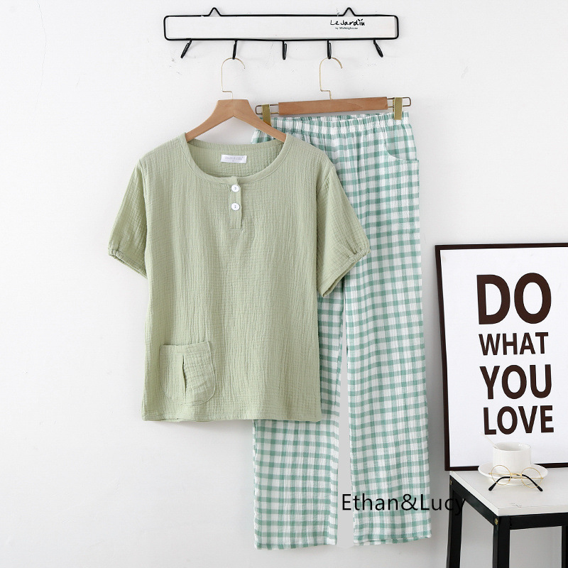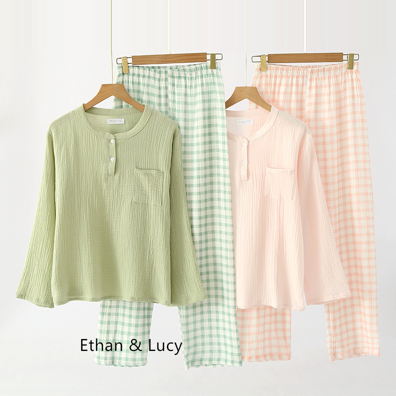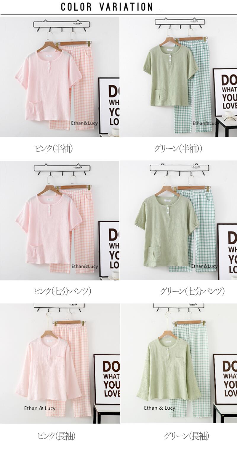 柔らか 綿100% ガーゼパジャマ レディース チェック柄 2重ガーゼパジャマ 7分袖 長ズボン ルームウェア 可愛い 春 夏 秋 綿100% コットン い 誕生日 プレゼント 女性 婦人 ナイトウェ