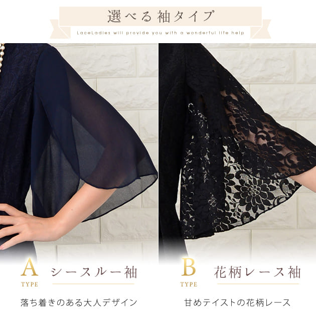 腕の動きに合わせ表情を変えるフレア袖は、花柄レース袖、シースルー袖の2タイプから選べます。
