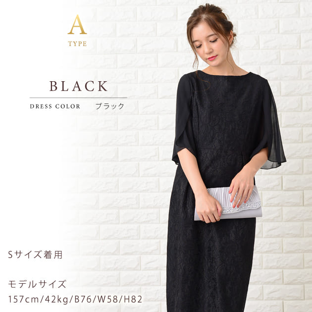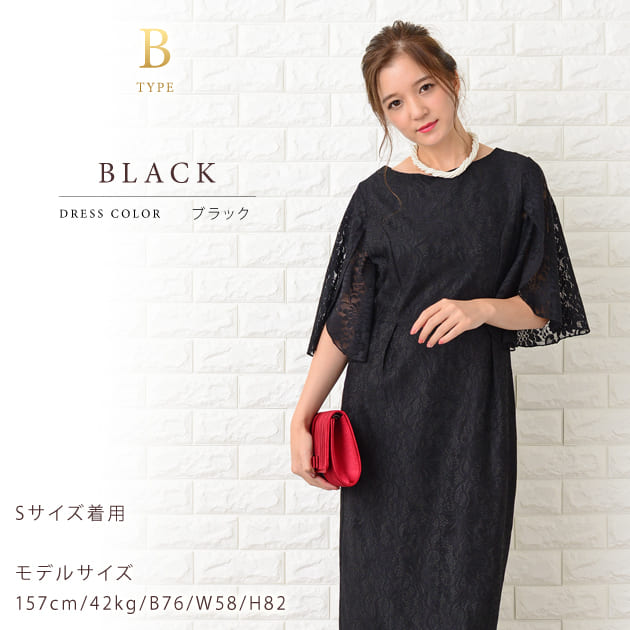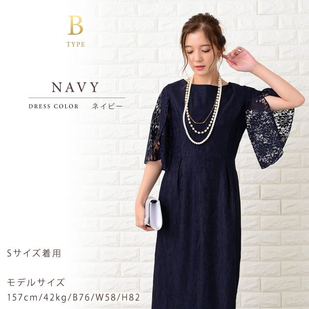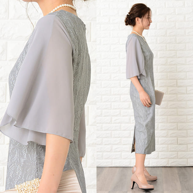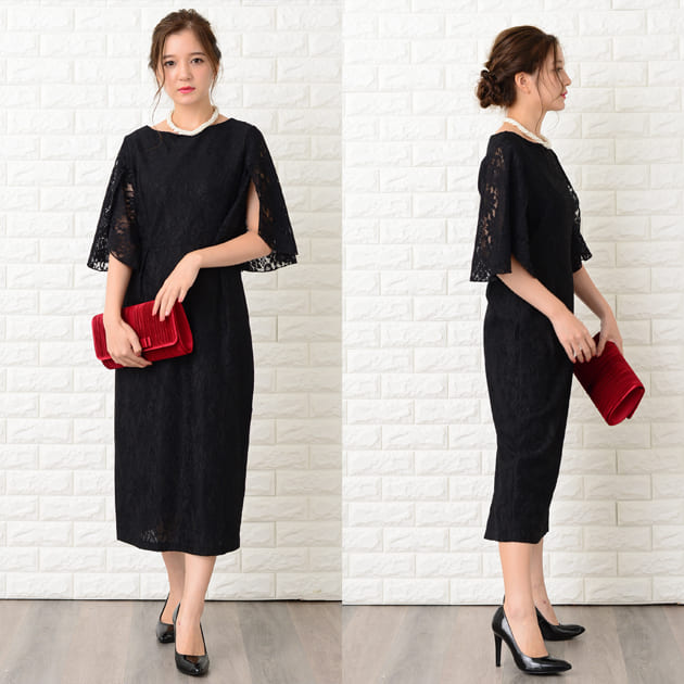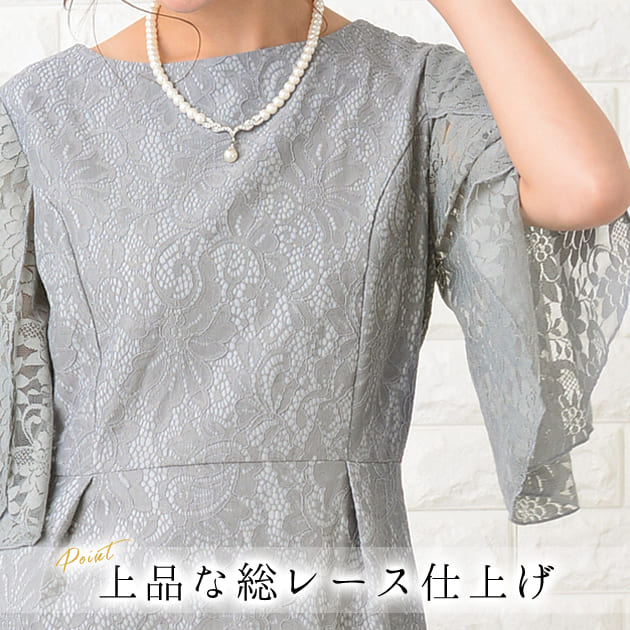 パーティードレス フレア袖 ワンピース レース袖 シースルー袖 ブラック ネイビー グレー パープル 結婚式 披露宴 七五三 入学式 フォーマル タイト ミモレ丈 五分袖 袖あり 袖付き 20代 30