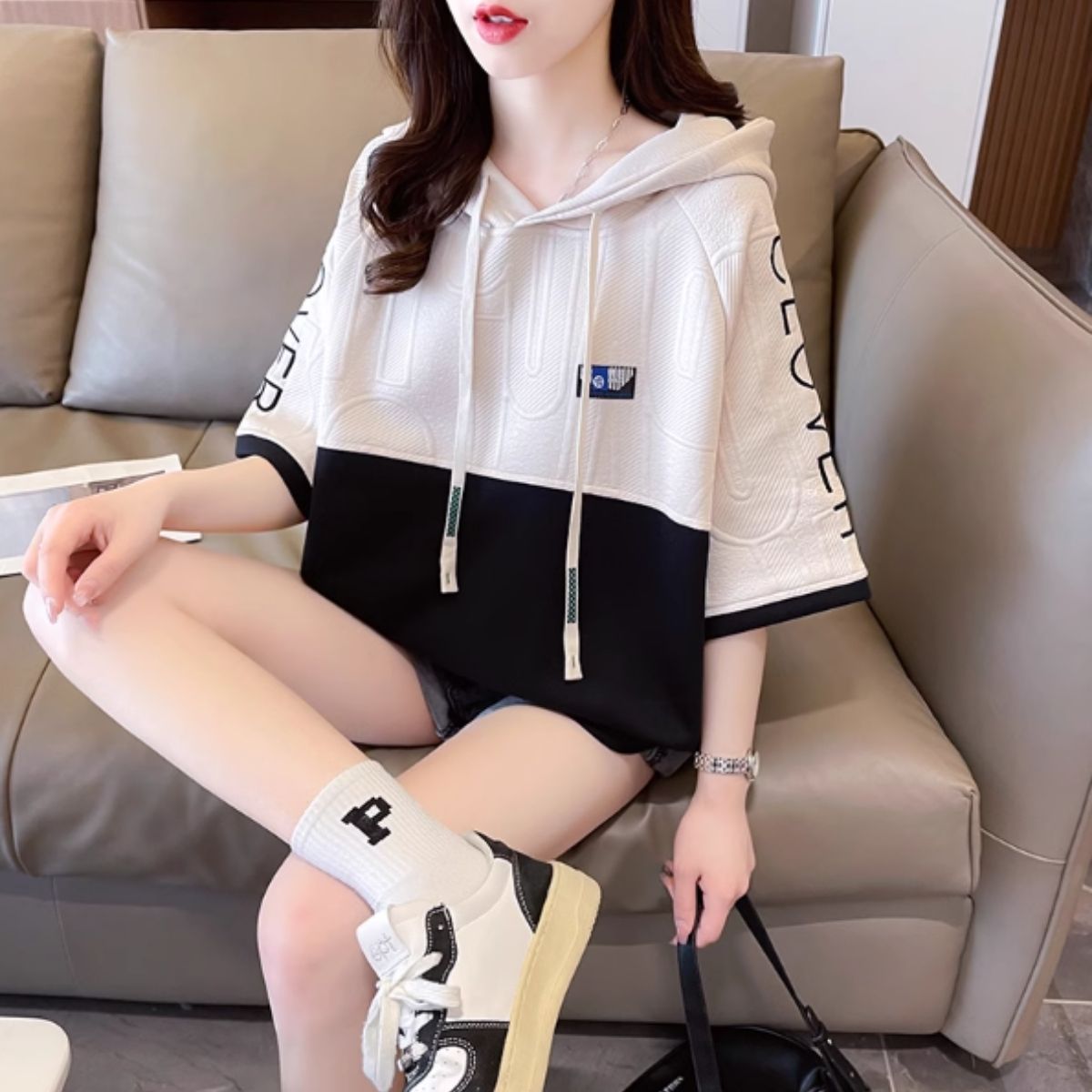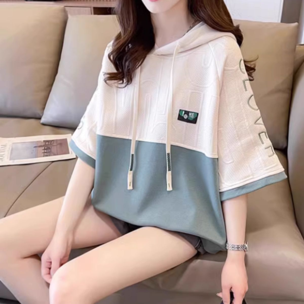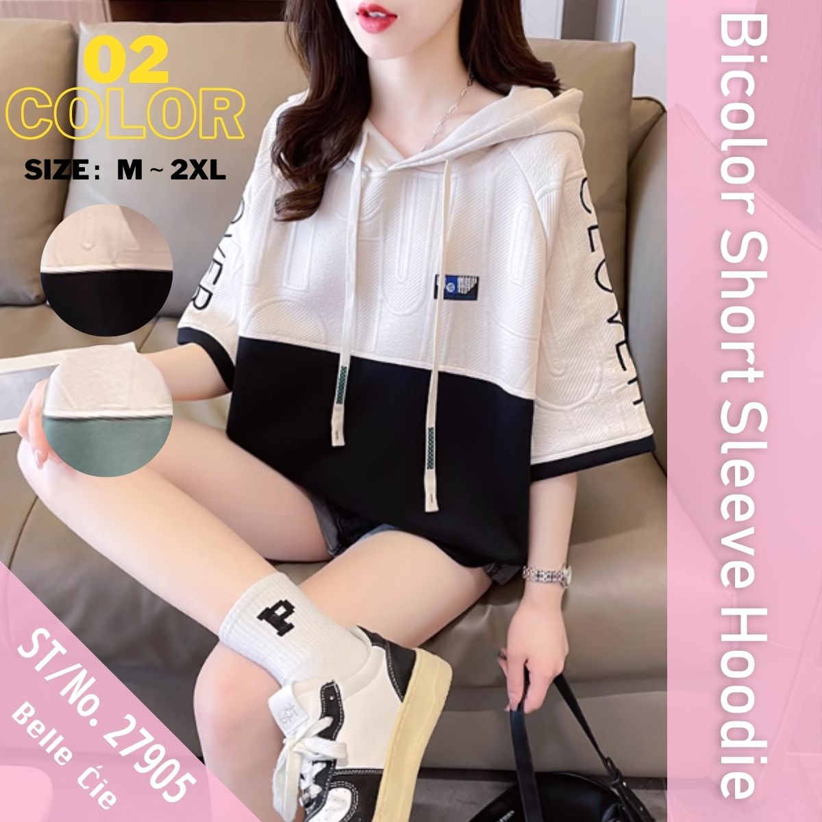 【バイカラー半袖フードパーカー】