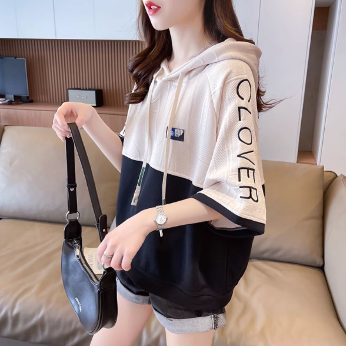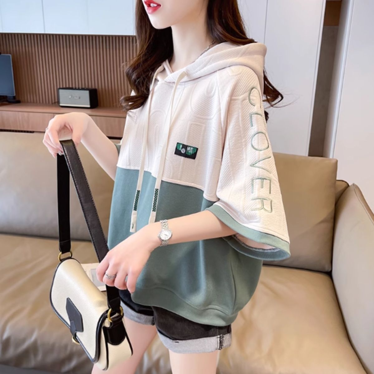 フードあり パーカー フーディ フードパーカー スウェット 半袖 レディース バイカラー カラーブロック 韓国ファッション かぶり プルオーバー