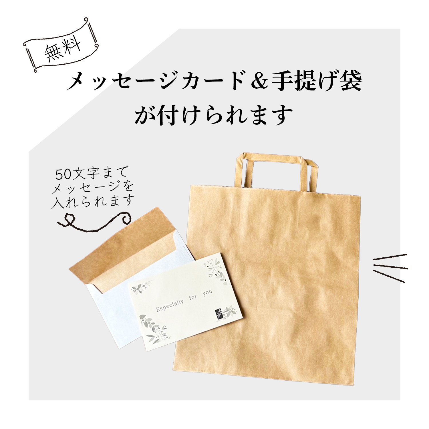 ※メッセージカードありを選択された場合でも、備考欄にメッセージの入力がない場合はメッセージカードは同封されません。手提げ袋 紙製の手提げ袋(無地)を無料で同封致します。