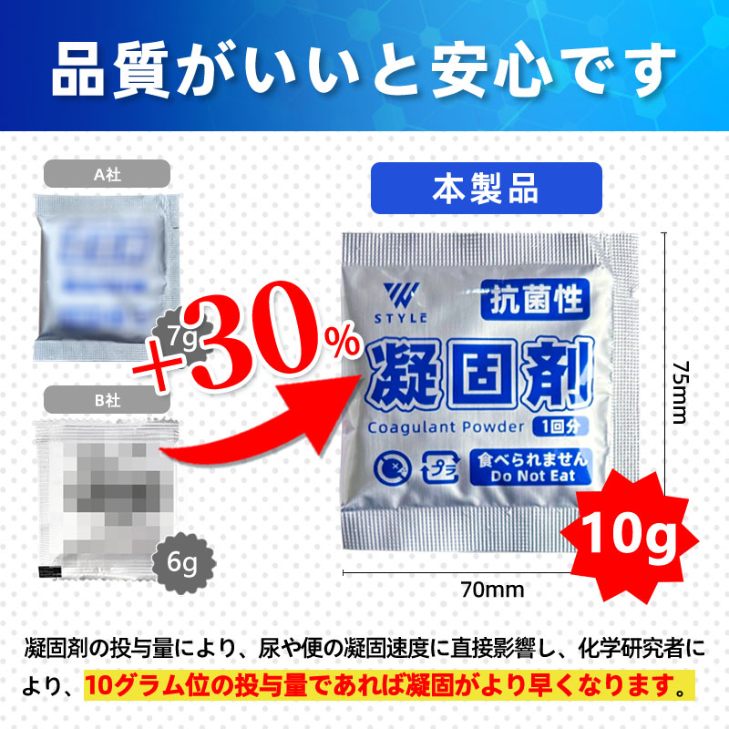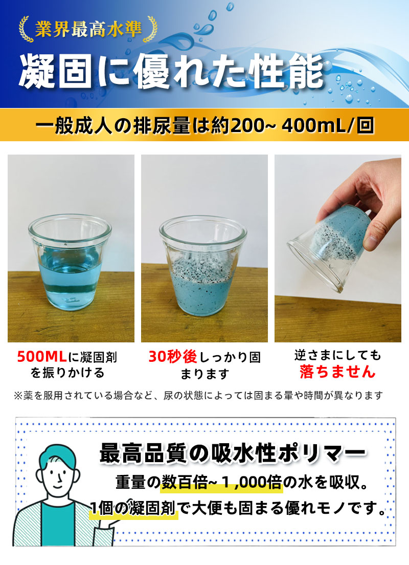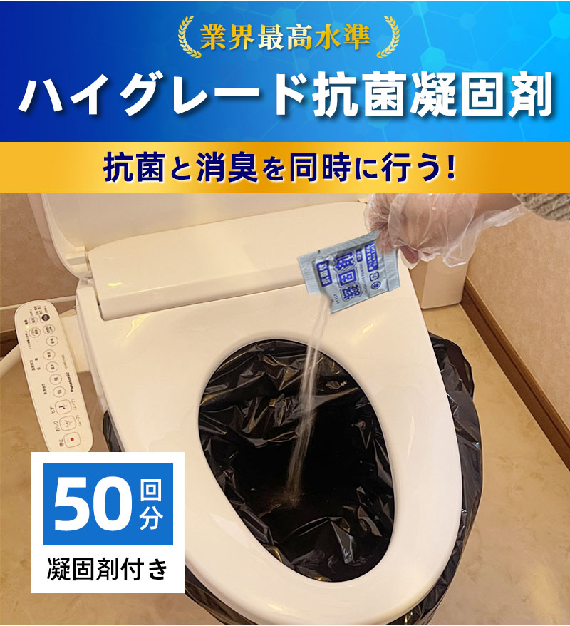 ◆◆【高強力な吸水性!】 弊社の凝固剤は10g入っています。しっかり固まります!非常時に役立つ簡易トイレです。振りかけるだけで固まってゴミとして処理できる!水なしですぐに固まります。地震・台風・豪雨といった自然災害や、事故による断水・水不足によってトイレが自由に使えなくなるなどの防災用携帯トイレとしても。さらに、キャンプや登山などのアウトドアで近くに水場がない状況に携帯トイレとしても大活躍します!