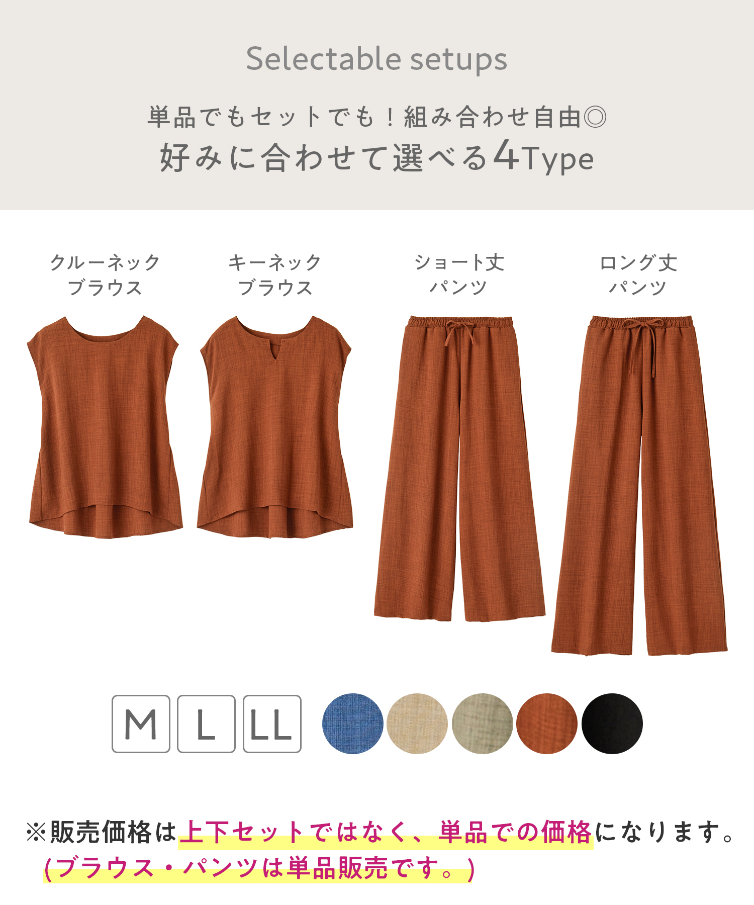 サイズ: 【パンツ/ロング丈/M】 【パンツ/ロング丈/L】 【パンツ/ロング丈/LL】 【パンツ/ショート丈/M】 【パンツ/ショート丈/L】 【パンツ/ショート丈/LL】 【キーネックブラウス/M】 【キーネックブラウス/L】 【キーネックブラウス/LL】 【クルーネックブラウス/M】 【クルーネックブラウス/L】 【クルーネックブラウス/LL】