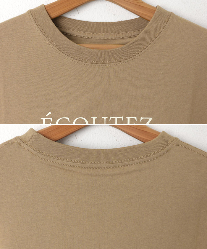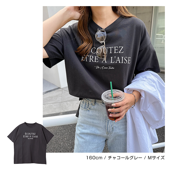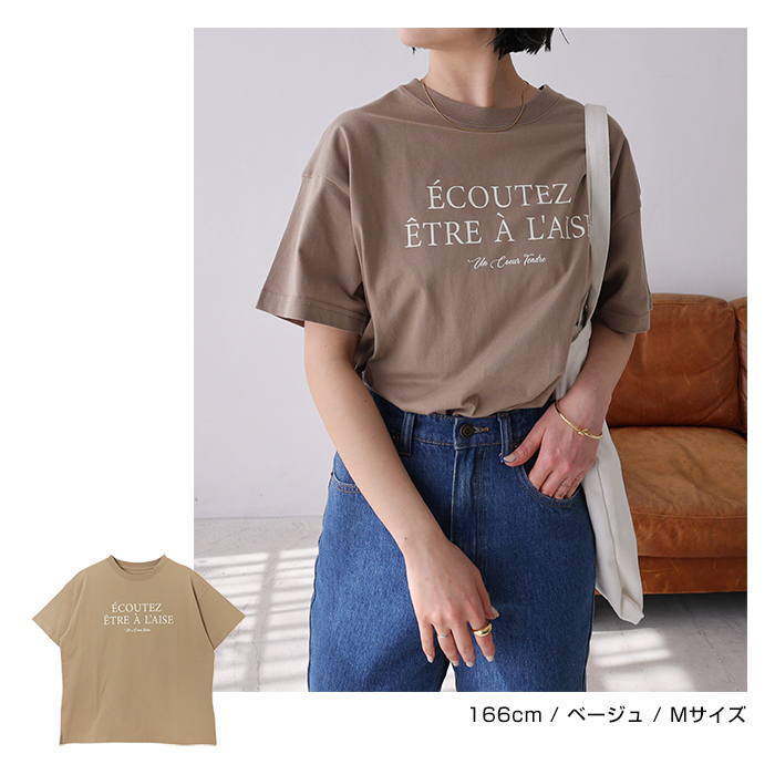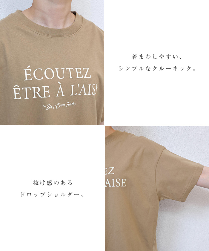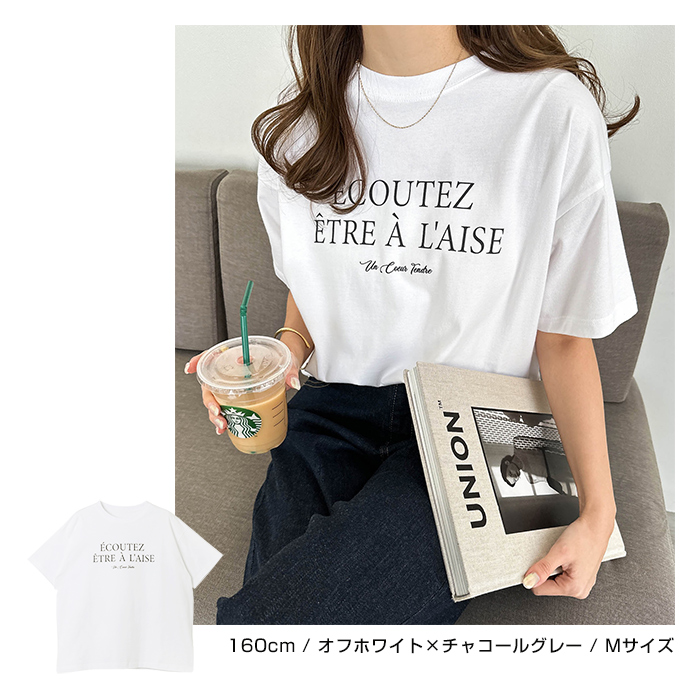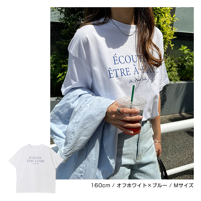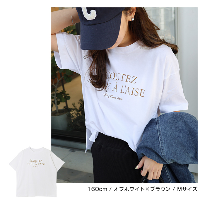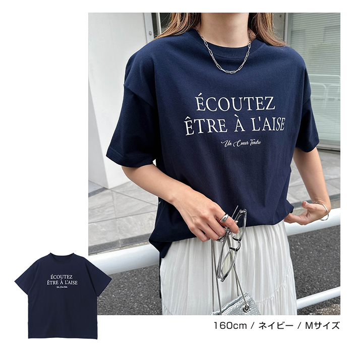 フレンチ ロゴプリント 半袖 Tシャツ レディース コットン クルーネック ドロップショルダー サイドスリット 抜け感 コーマ天竺 S Mサイズ 春 夏 秋