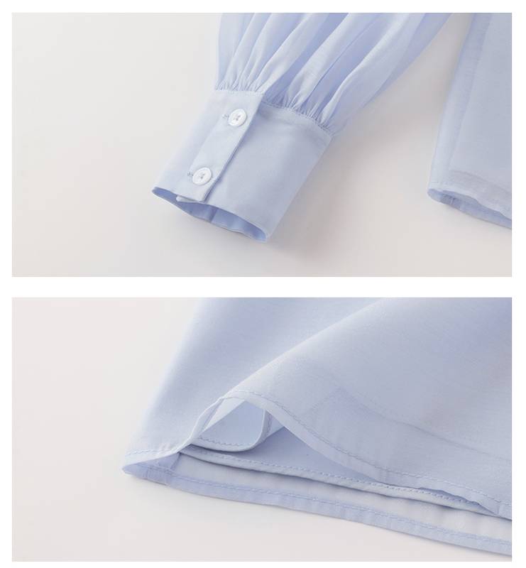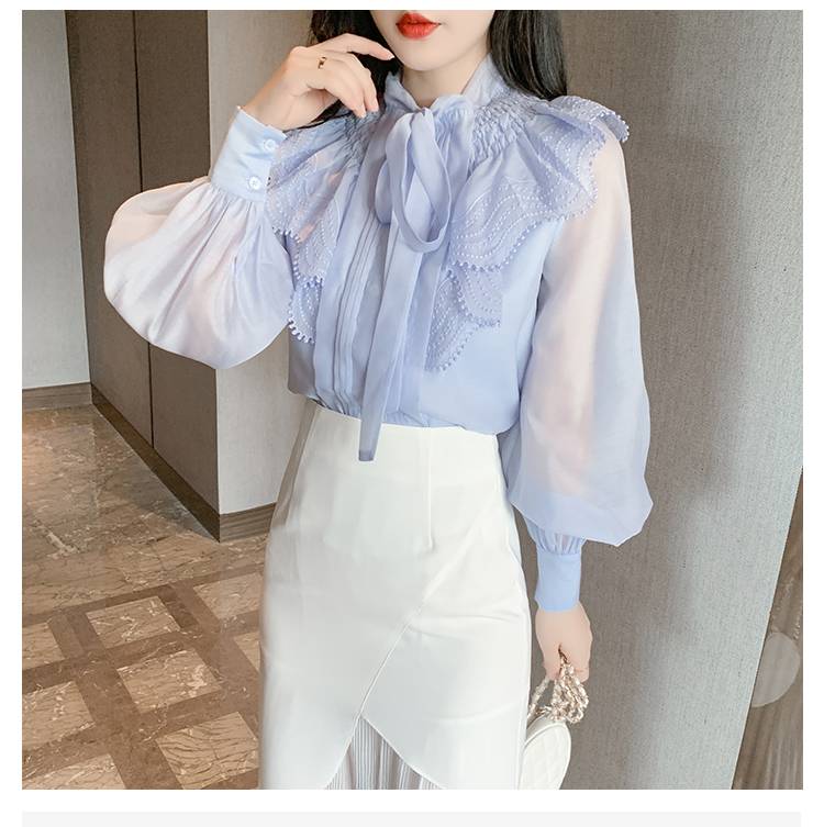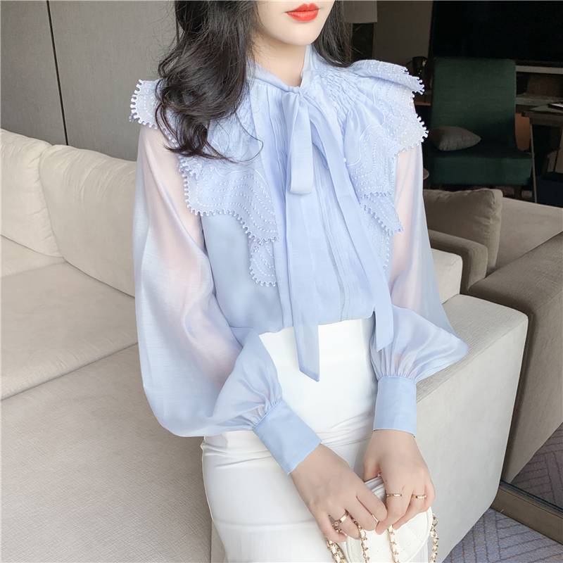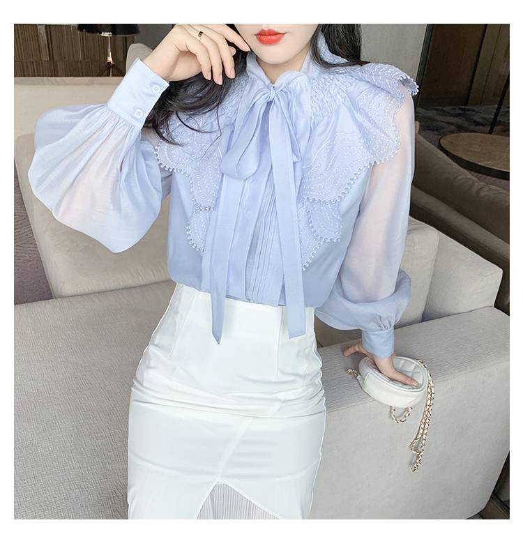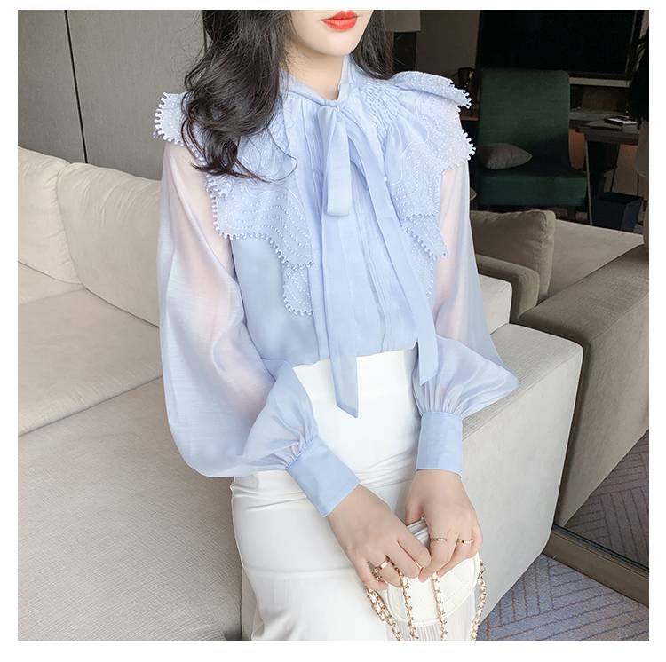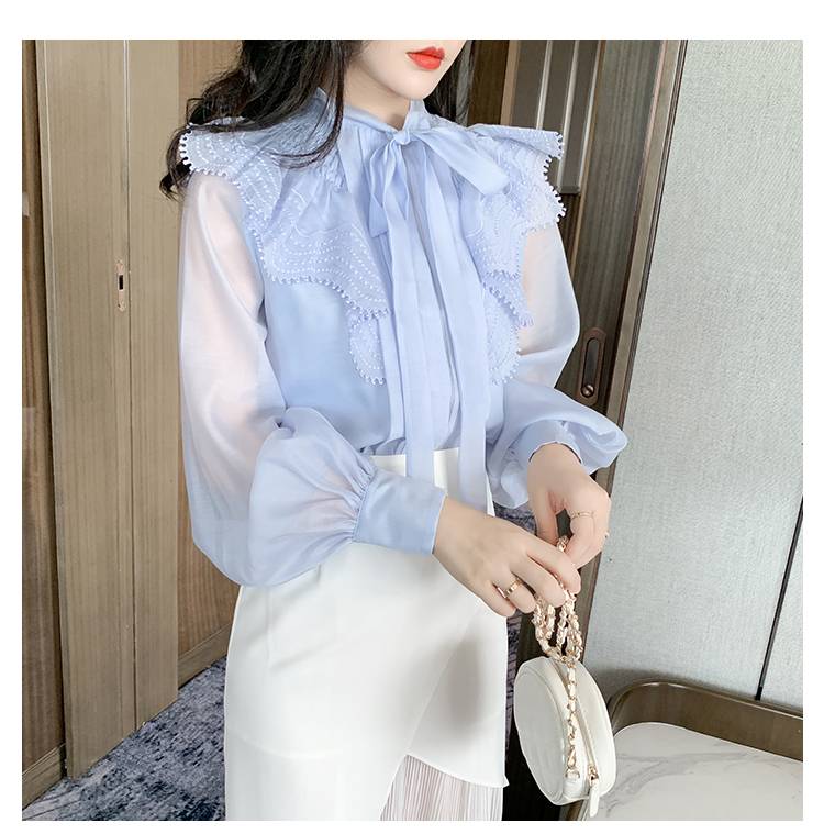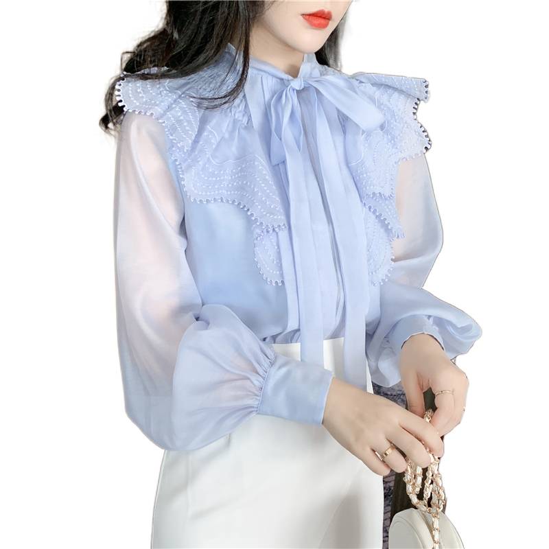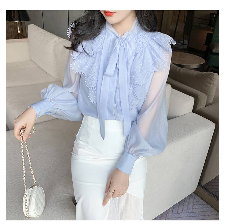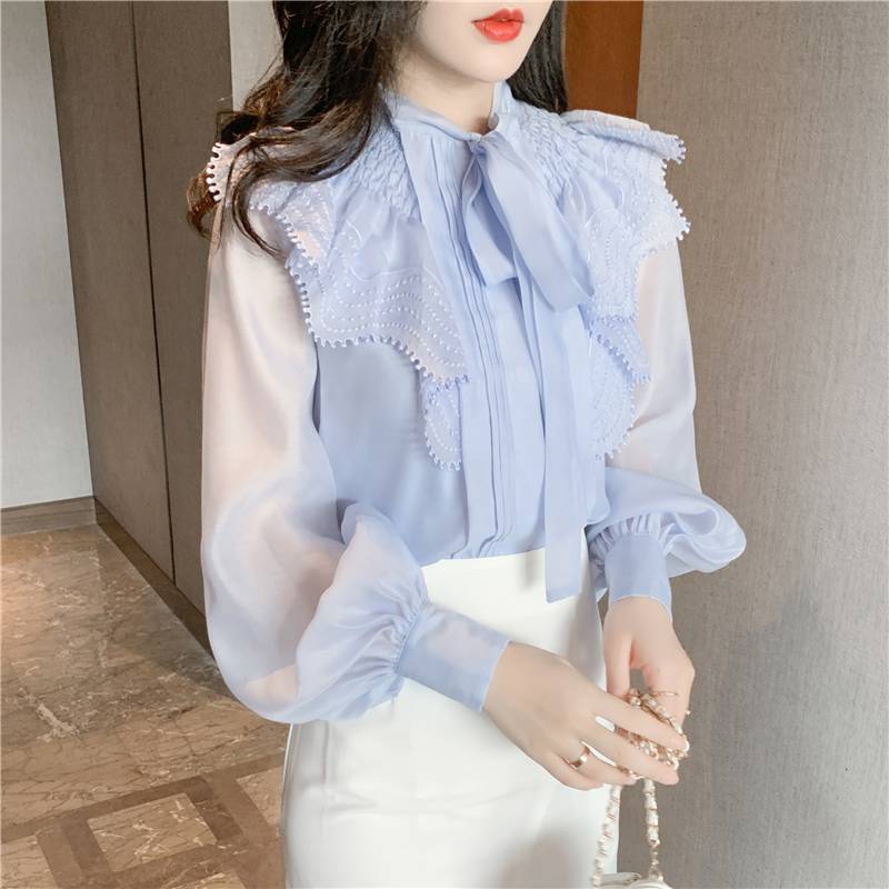 トップス レディース シャツ ブラウス シースルー 長袖 春 水色 リボン フリル 透け感 休日 お出かけ デート コーデ 普段使い 女子会 ファッション エレガント おしゃ