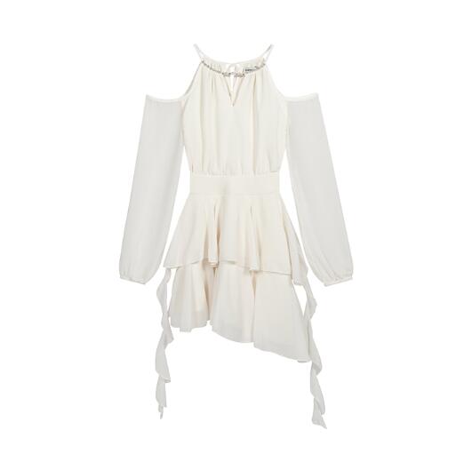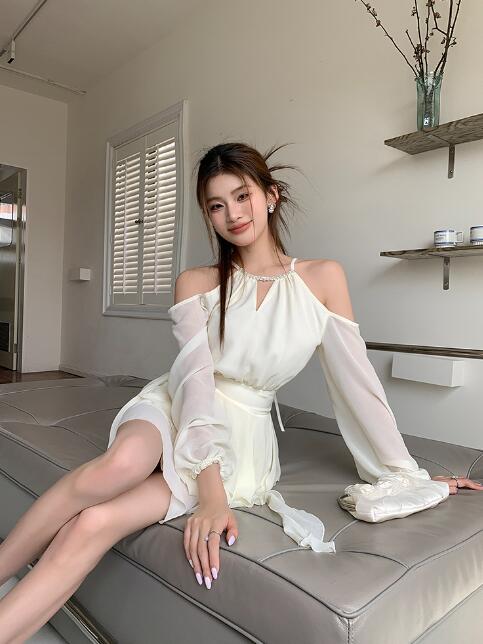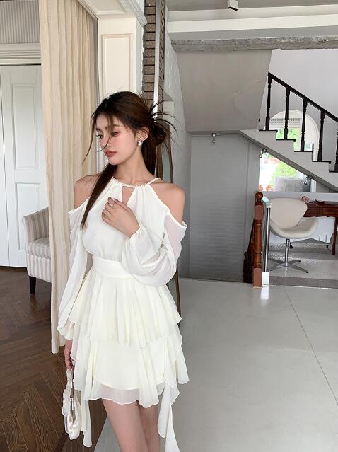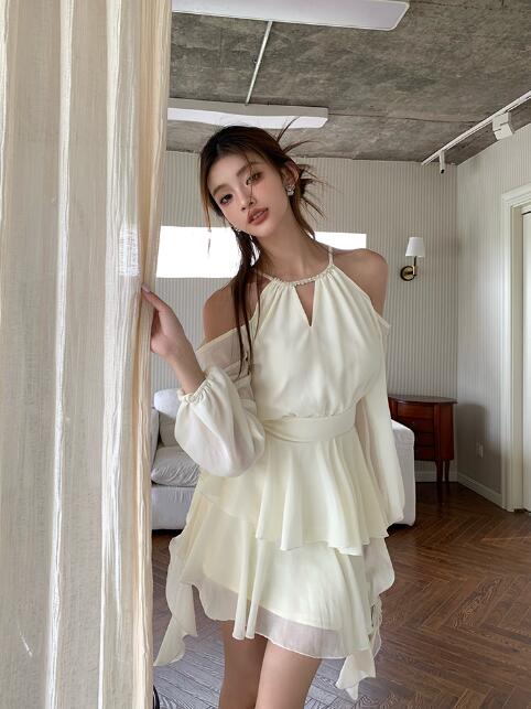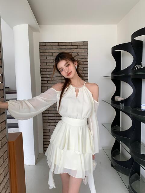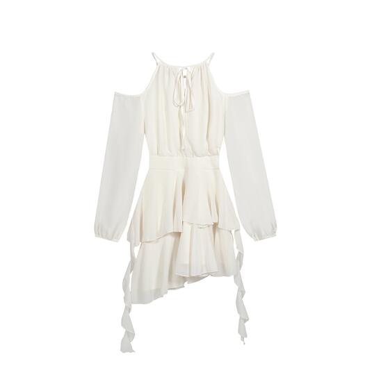 ワンピース 結婚式肩出しシフォン着痩せ