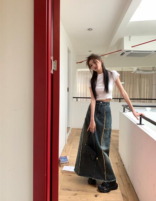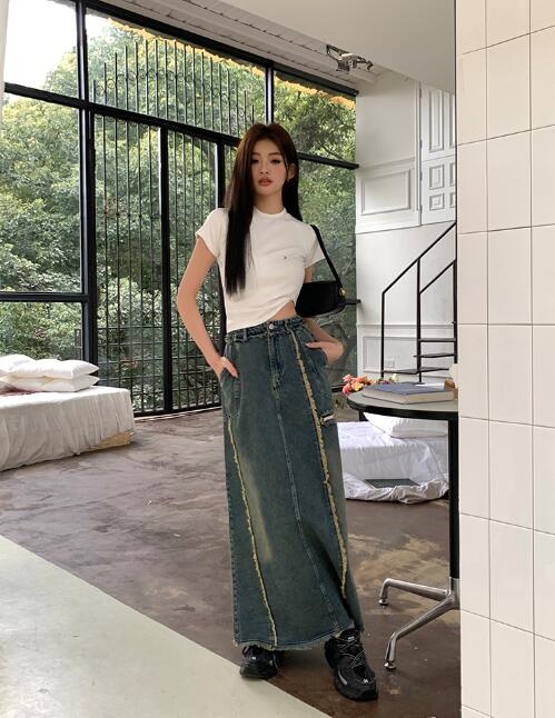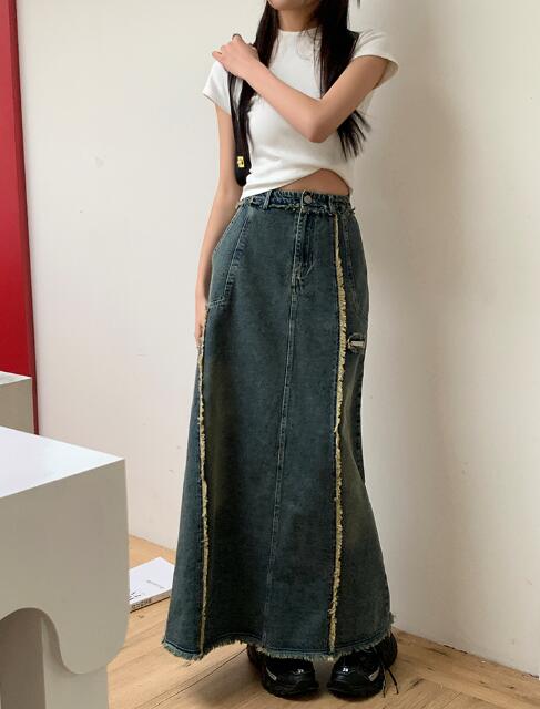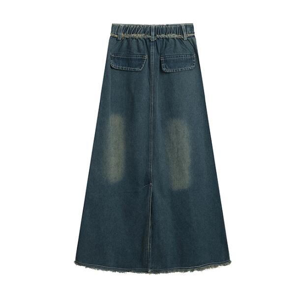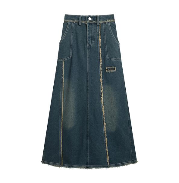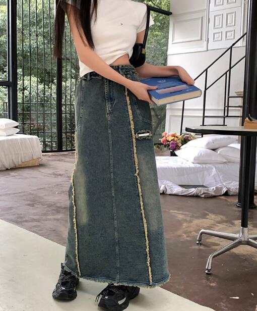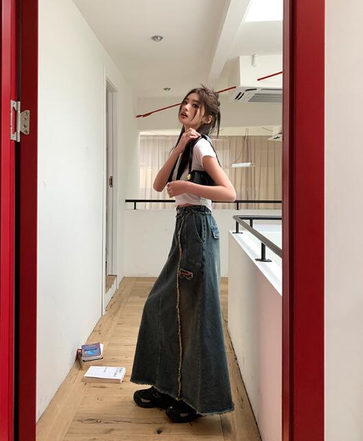 デニムスカートロングタイトAラインレディースガールズおしゃれ可愛いかっこいい韓国ファッションスリットレースアップボトムス膝下膝丈原宿ストリートヒップホップブルー青レトロヴィンテージ風