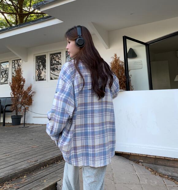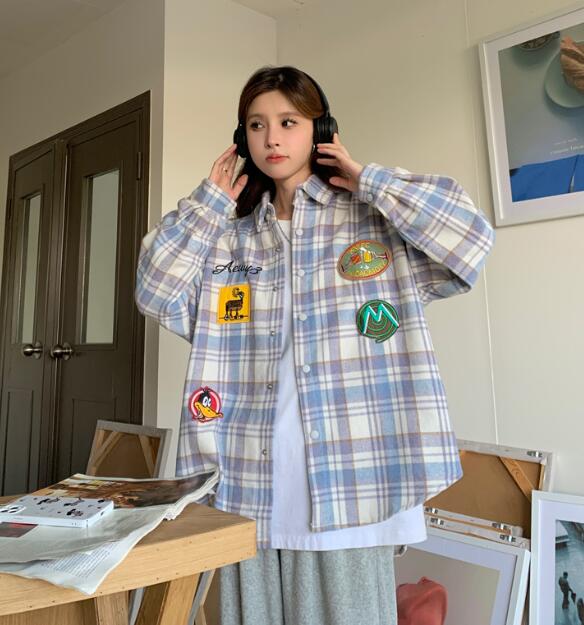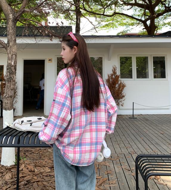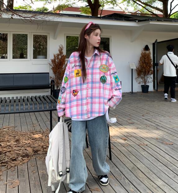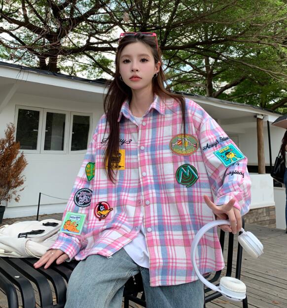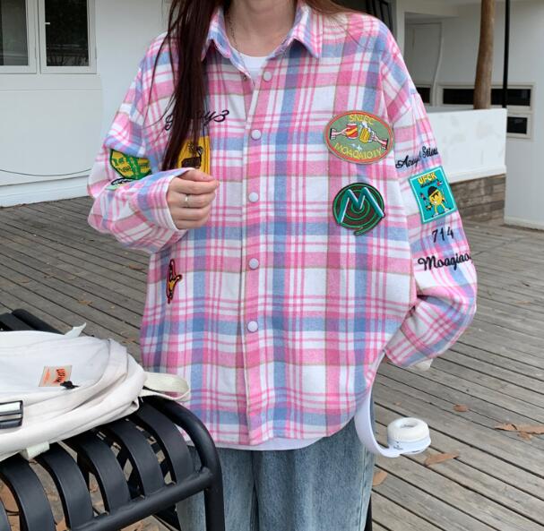 チェック柄トップスシャツ長袖ワッペンロ