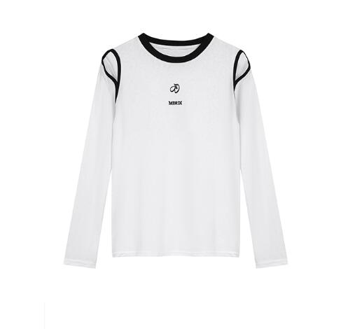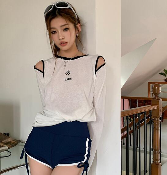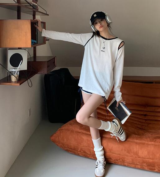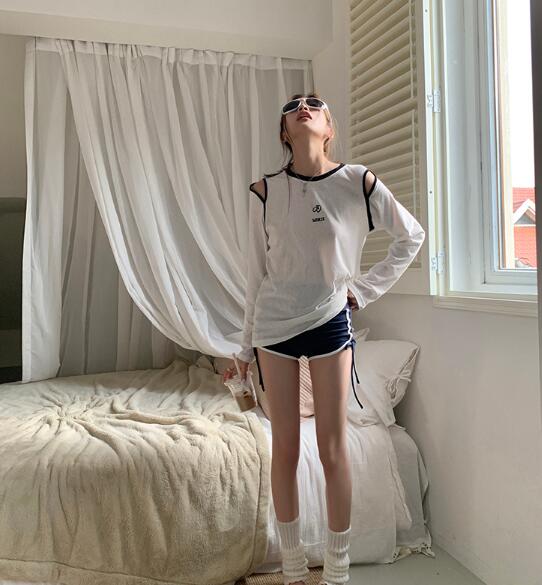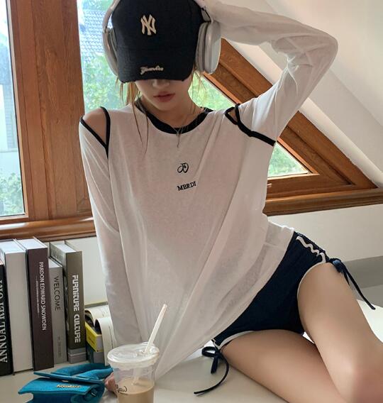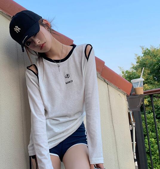 肩出し長袖トップスカットソーTシャツ刺
