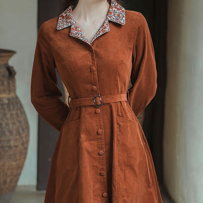 秋冬 秋 冬 レディース ワンピース シャツワンピース レトロ レトロワンピース 襟袖口花柄 ミモレ丈 ロング 長袖 きれいめ シャツワンピース シャツワンピ 着痩せ 大人カワイイ 大正ロマン 昭和レ