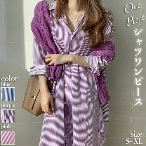 シャツ ワンピース ロング レディース 長袖 春 ライン 前開き 体型カバー ストライプ 襟付き 開襟 青 ブルー ピンク 紫 3色展開 お散歩 お出かけ マタニティー マ