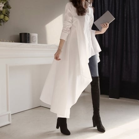 ワンピース レディース シャツワンピース ミディアム丈 ルーズ 七分袖 アシンメトリー 襟付き ゆったり ロングテール フレア ライン こなれ感 かわいい 大人可愛い きれいめ シンプル