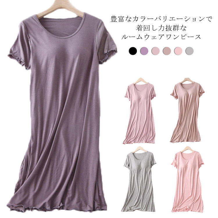 レディース クールネック 部屋着 寝間着 無地 春夏 ロング丈 春夏 体型カバー 薄手 可愛い お洒落 パジャマ カップ付き