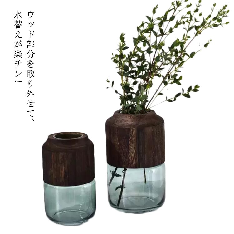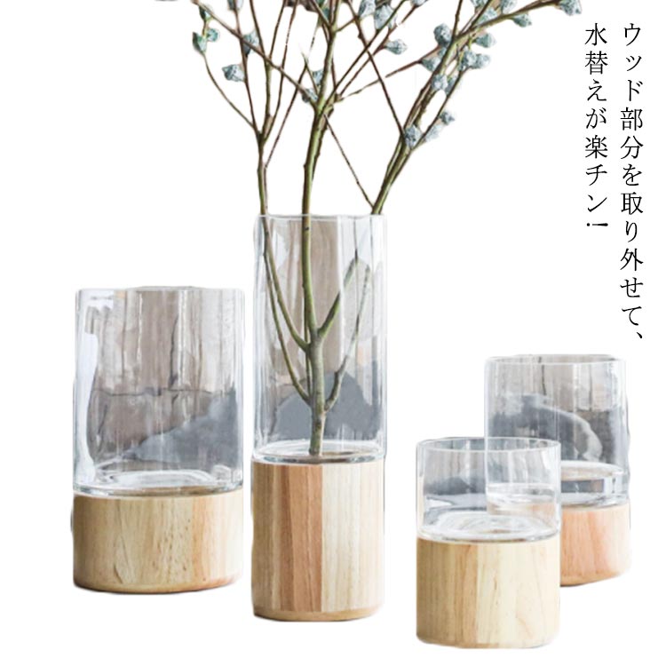 フラワーベース 大きい ガラス 直径14 ギフト 花器 高23 木製 花瓶 シンプル 円柱 丸 天然木 母の日 大きい ガラス キャンドルホルダー