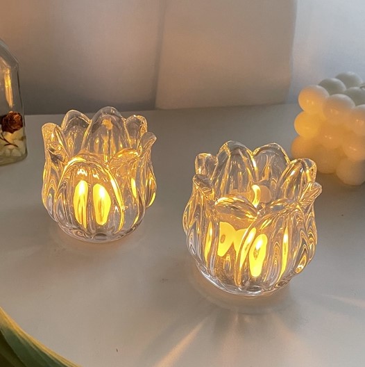 2点セットチューリップ型花柄花型キャンドルホルダー透明ガラスおしゃれ韓国雑貨インテリアアンティーク小さいキャンドル置きかわいいクリア可愛いセット